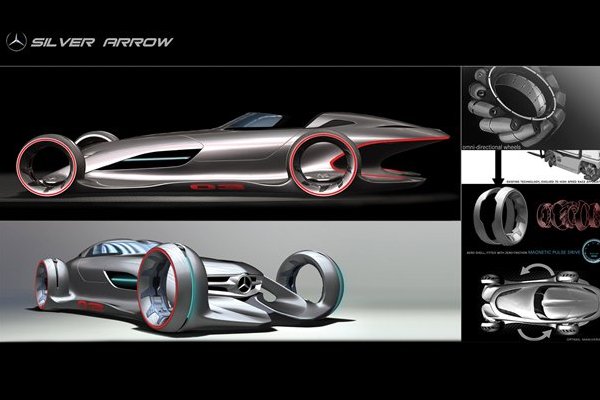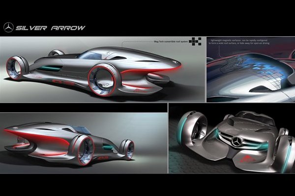 A Mercedes régi F1 versenyautói által inspirált Silver Arrow nem ennyire apokaliptikus viszonyokra épült, de tervezői “átlósan konfigurált, agymentes hajtást” álmodtak alá, mely “minden irányú manőverezhetőséget” ad az autónak. Nem teljesen világos, hogy ez alatt mit értenek...