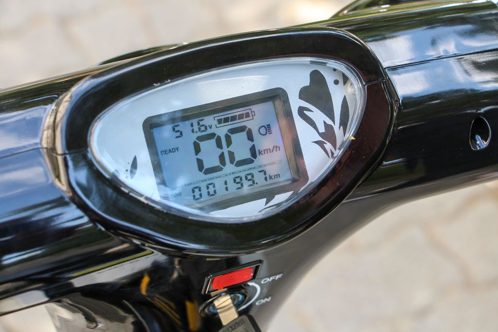 Azt persze már az első és igen rövid próba alapján láttam, hogy a 35 km/órás végsebességből már közepes emelkedőn is csak 30 km/órás csúcstempó marad. De az sem rossz ám, lefelé meg persze, hogy túl lehet lépni a katalógusértéket is, kellhet (józan ész szerint is kellene) a bukósisak. A hatótáv nagyvonalú 45 km a viszonylag parányi 11 Ah-s, ám 48 voltos akkumulátorral. Ez napi ingázáshoz, de még akár nagyobb városok felfedezéséhez is untig elegendő. Bár a Cruzoe leginkább járdára való, jól jön, hogy van rajta féklámpa, hátrafelé villogó irányjelző és LED fényszóró is. Utóbbi mondjuk inkább jelzőfénynek tűnik, mintsem valódi fényszórónak, de azért a kerékpárok lámpáit minden bizonnyal lepipálja.