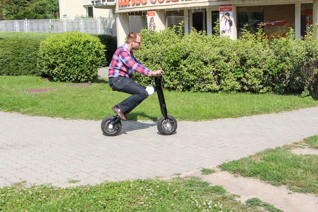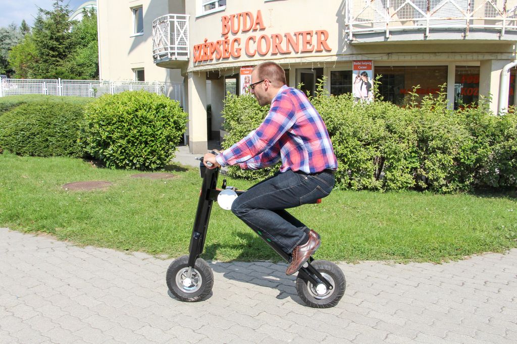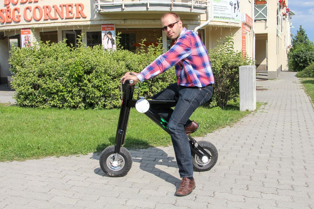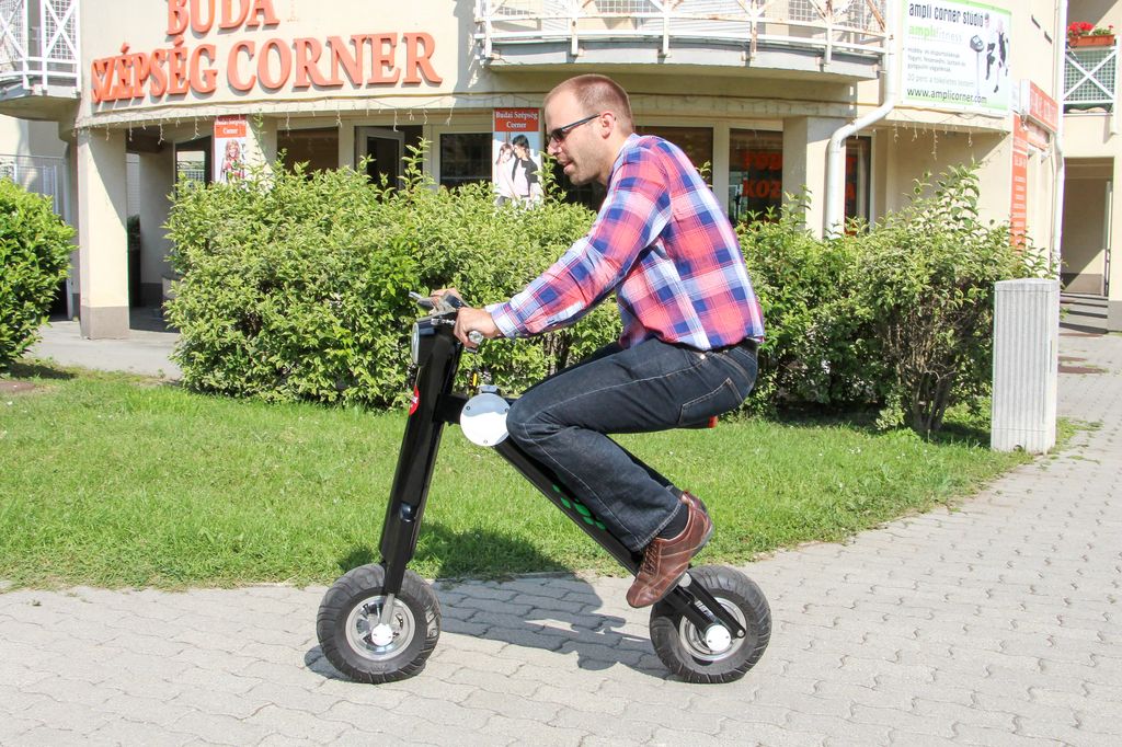 Összecsukott állapotban a Cruzoe 125x58x30 centiméteres, így a legtöbb autó csomagterébe üléshajtás nélkül is befér. Gond nélkül berakható egy liftbe, s az irodában is elférhet akár íróasztalunk mellett/alatt. 29 kilogrammos saját tömegével hölgyek mondjuk nem fogják emelgetni, de férfiember azért elboldogul vele, mint a cementes zsákkal. Az alumíniumvázas járgány 120 kilogrammal terhelhető, azaz még az átlagnál testesebbek alatt sem roppan össze. Apró, 13 colos abroncsain (ez nem az autók 13 colos méretével egyező, esetükben ugyanis a felni átmérőjét jelölik, itt pedig a gumiéról van szó) jól gurul, de arra nem alkalmas, hogy járdára menjünk fel vele. Azokra felhajtó híján fel kell emelni. A Cruzoe ugyanis közúti forgalomba nem való, csak járdán közlekedhetünk vele, s 300 wattos motorjával még éppen nem rendszám- és vizsgaköteles. Ráadásul még bukósisak sem kell rá, azt ugyanis a kerékpárokra - aminek számít KRESZ szerint a Cruzoe - csak 40 km/órás sebesség fölött kell, a Cruzoe végsebességadata pedig 35 km/óra. [BANNER type="1"]