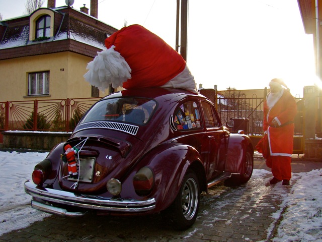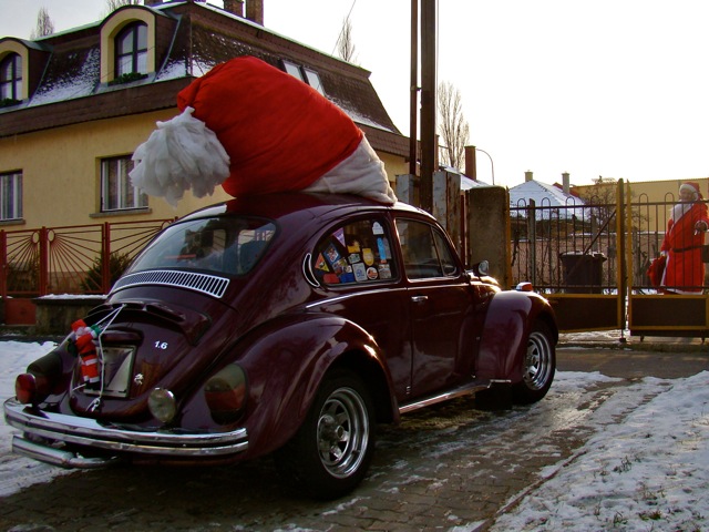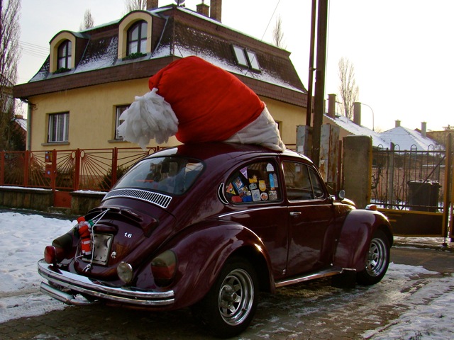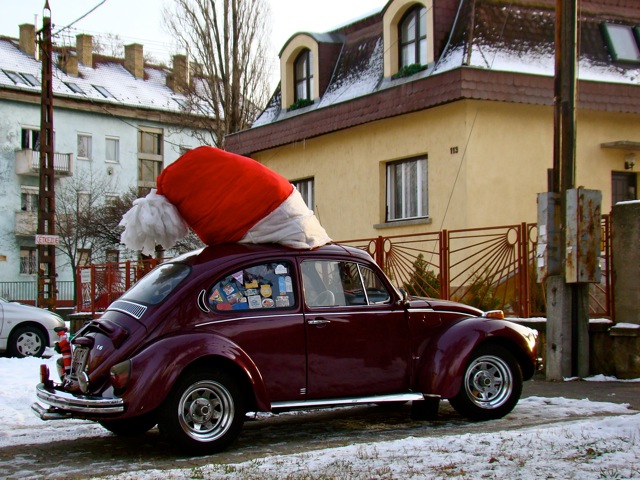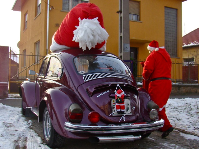 Feltűnt a szürke vasárnapi forgalomban egy régi Bogár, amely hatalmas, piros-fehér sapkát viselt. A rendszámtartójára egy kis Mikulás mászott épp fel... félreálltunk egy percre, hogy lefotózzuk. És aztán, mint a mesékben, egyszer csak ott termett a tulajdonos, maga a Mikulás, talpig pirosban, hátán egy hatalmas puttonnyal, s odalépett hozzánk.