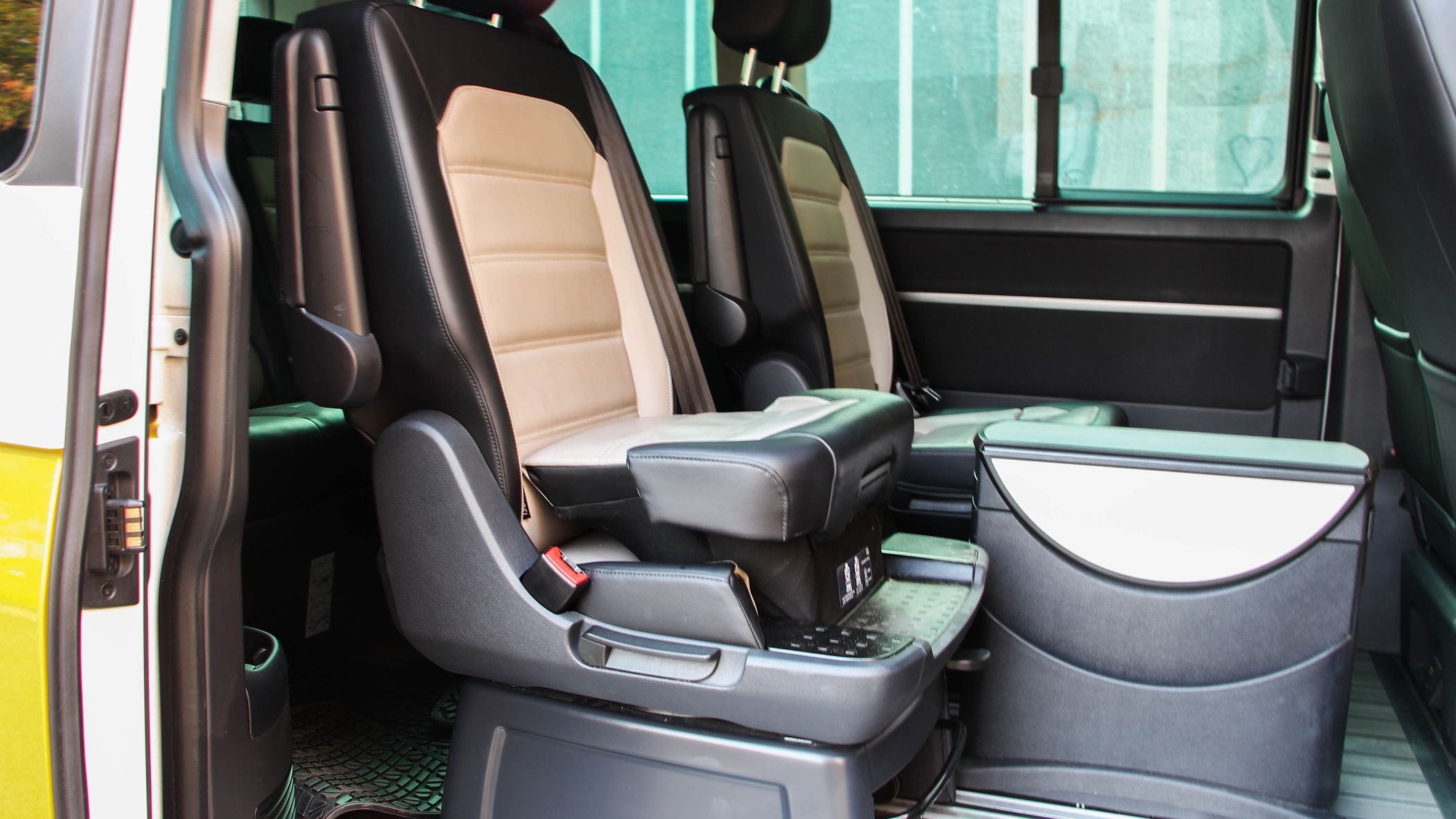 Apropó tárolórekeszek. Telepakolták velük a Bullit, szóval érdemes az utastér minden centiméterét alaposan átnézni, mert tényleg rengeteg hely jut az apró-cseprő dolgoknak is. Beszállni sem macerás, hiszen mind a két oldalon elektromos tolóajtók találhatók, amelyeket a műszerfalon elhelyezett gombbal is lehet nyitni-zárni, így kész buszvezetőnek érezhetik magukat a sofőrök. Vagy inkább villamosvezetőnek (főleg a sárga Bulliban), mert a nagy buszokon csak az egyik oldalon vannak ugye ajtók. Viszont a hátsó nyílás már más lapra tartozik. Csak és kizárólag manuálisan mozgatható a hátsó ajtó, ami a termetessége miatt nem könnyű mutatvány. Főleg a lecsukása.Gombnyomásra nyílnak és záródnak az oldalsó tolóajtók
