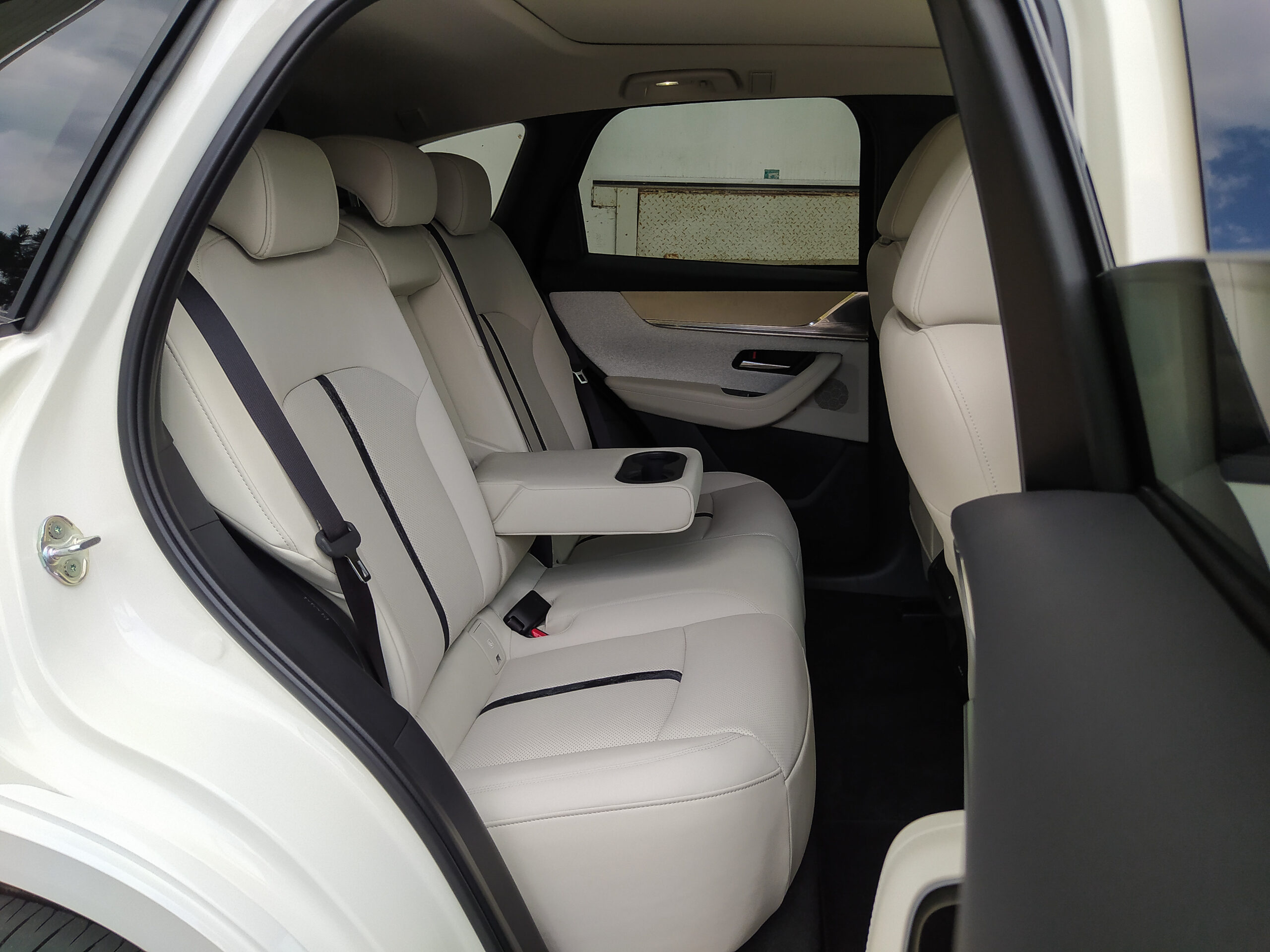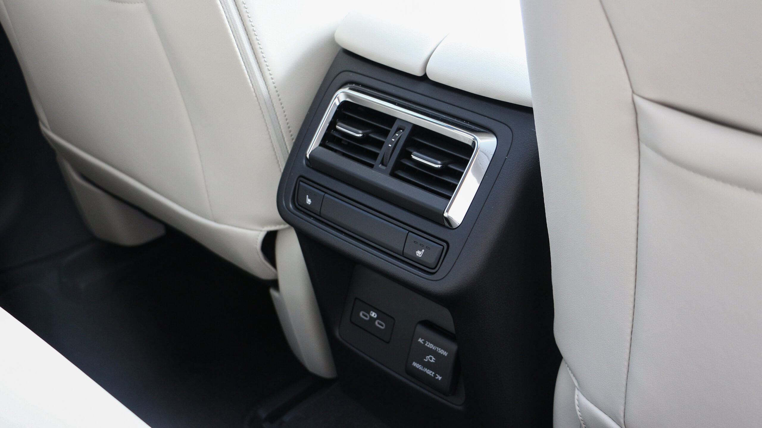 Ezután a gombokkal korrigáltam a testem aránytalanságából adódó apró tévedéseket, majd a rendszer az arcfelismerő funkcióval elmentette, hogy nekem milyenre kell beállítani az autót. Állítólag ehhez további több száz adatot társítana még a gép, ha továbbra is én használnám, a vezetési stílusomtól az audiorendszer beállításain át mindent hozzárendel az arcomhoz. Hátul bőséges lábtérrel és egy látványosan két személyre formázott, ám háromnak is elegendő szélességű, kényelmesen párnázott padot kínál természetesen könyöklővel, külön klímazónával és két fűtött ülőhellyel.Sem a fejtérre, sem pedig a lábtérre nem lehet panasz a CX-60-ban