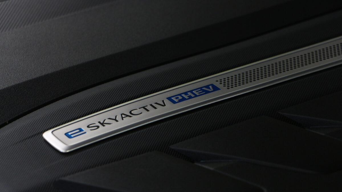Az igényesség a motortérben is folytatódik: a teleszkópos motorháztető aljára felakasztható, felnyitható burkolaton elegánsan feszít az e-Skyactiv PHEV felirat