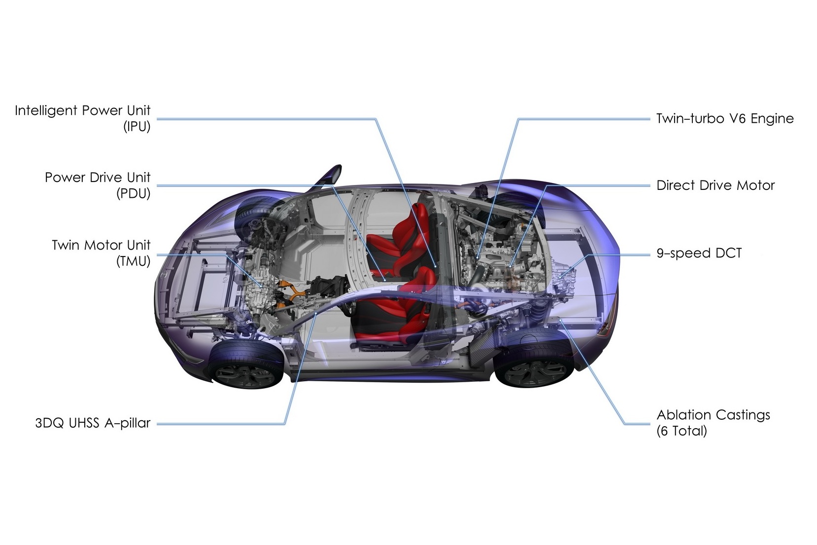 Elöl a kerekek között kettő, a hátsó tengely előtt pedig egy villanymotort és a fő V6-os duplaturbós benzinest helyezték el