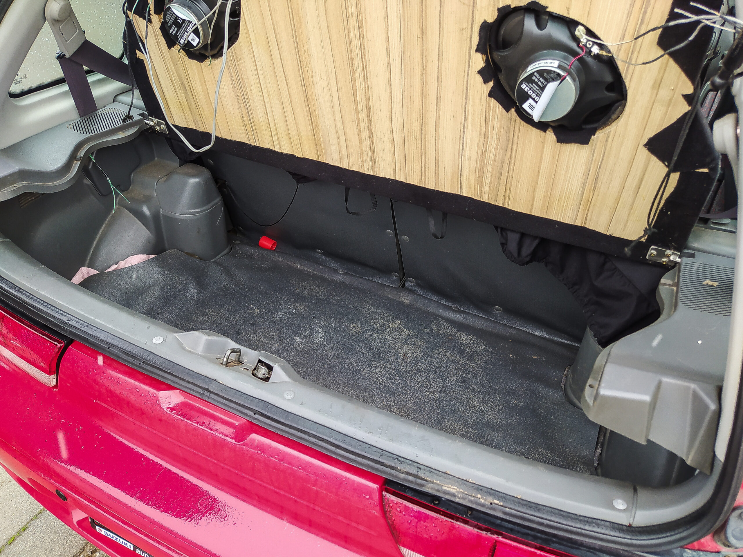 Két érdekesség hátulról: az első elektromos ablakemelők kapcsolói a kézifék mögött kaptak helyet, az utólagos kalaptartón pedig két JBL hangszóró gerjeszti a hullámokat