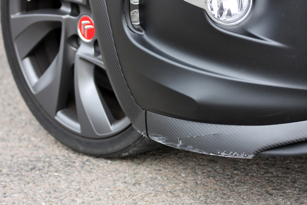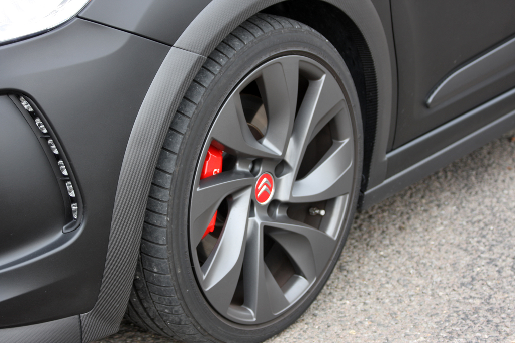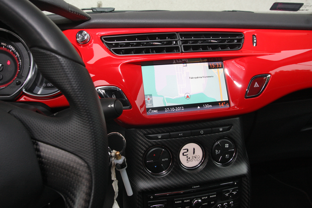 De vissza a márka prémiumcsaládjának legkisebb hercegéhez: a DS3 Racing ugye 1,5 centivel laposabb a standard DS3-nál, nyomtávja viszont 3-mal szélesebb, s a kerékjáratok szénszálas domborítása alatt 18"-os könnyűfém kerék figyel /40-es abronccsal és piros féknyereggel. A 18 col azért elég durva, ekkora van a WRC-ken is. Aszfalton. Murván meg 15-ös. Durván látványos még a szpojlerezés, továbbá elöl a színes betét-függőleges LED-sor kombó, hátul meg a diffúzor-dupla kipufogó együttes vonzza a tekintetet. Piros a tükör, szolid a Loeb-féle felirat oldalt, markánsabb, bár kevéssé észrevehető a tetőn.