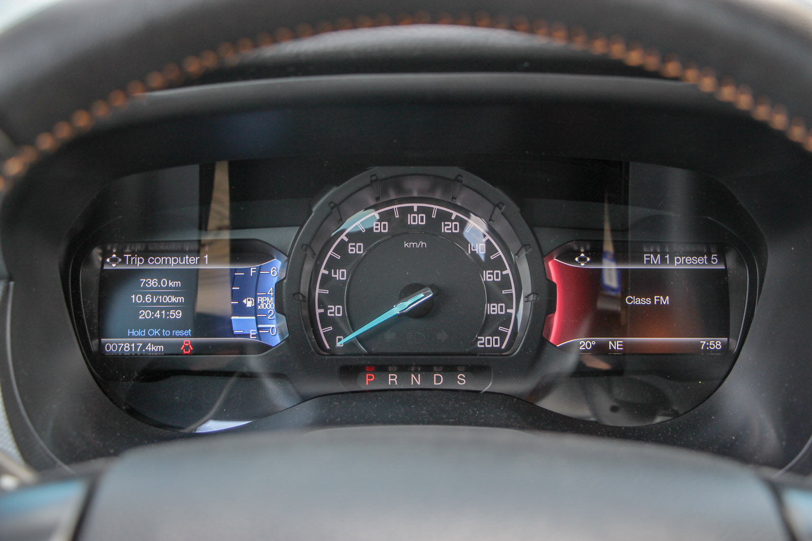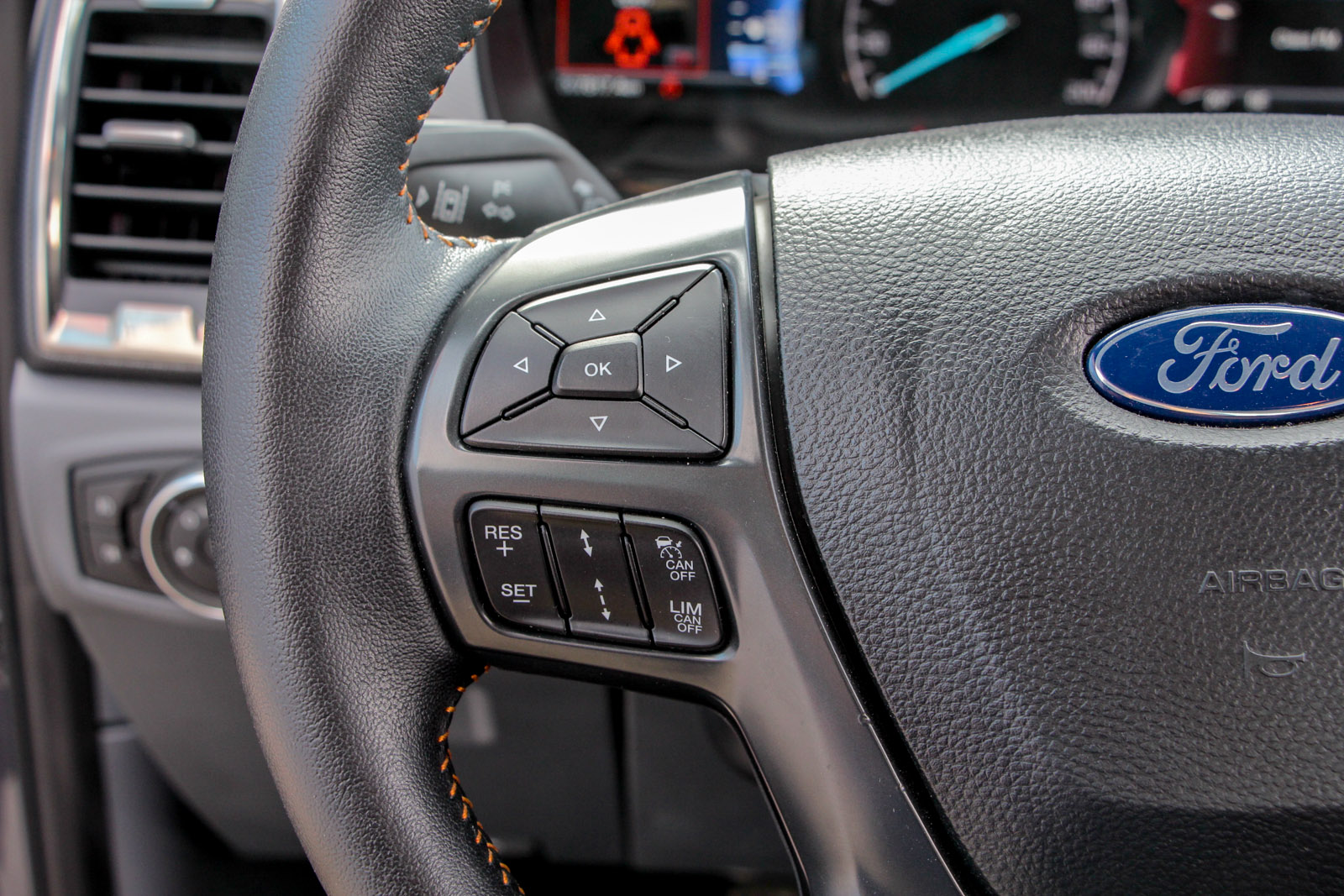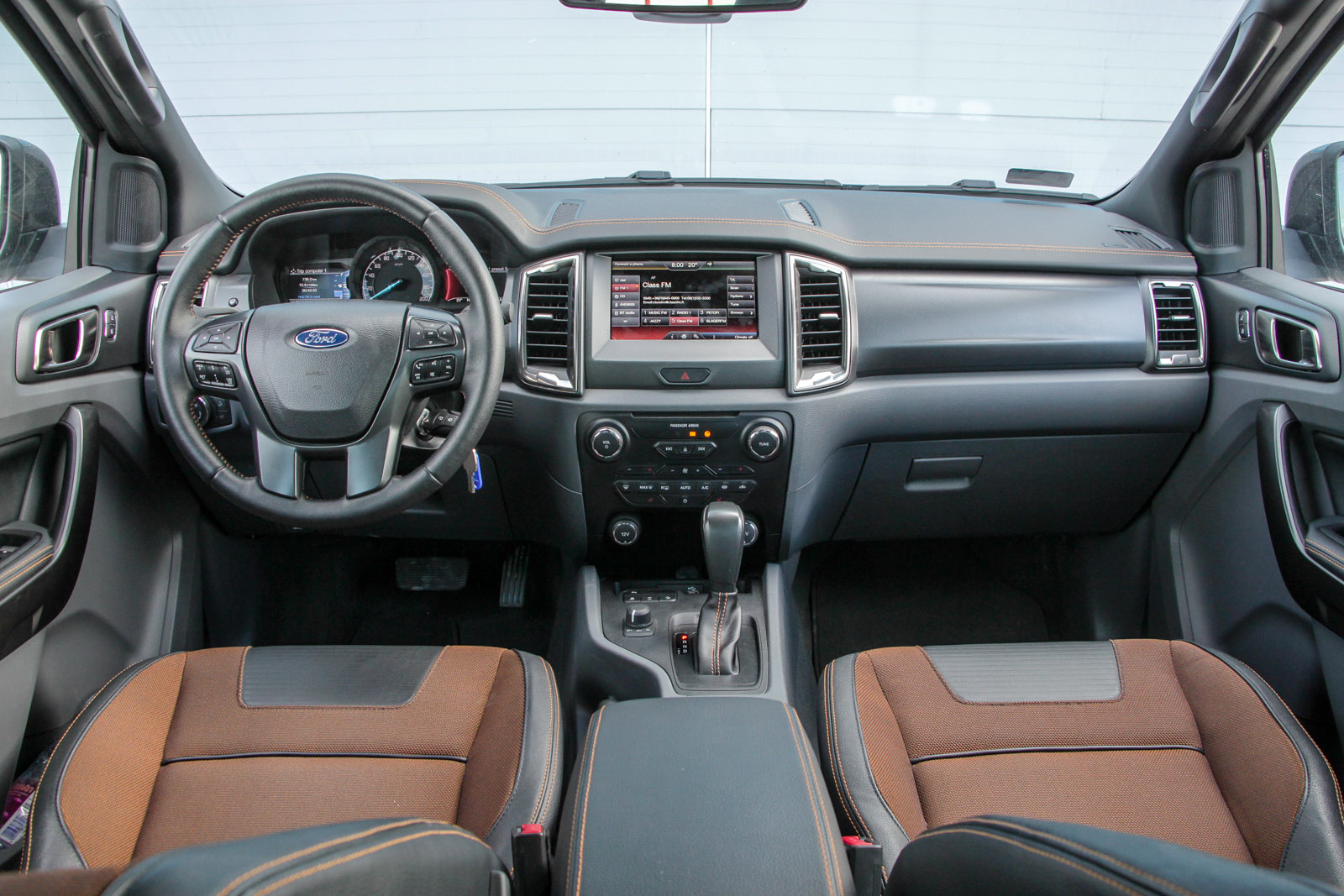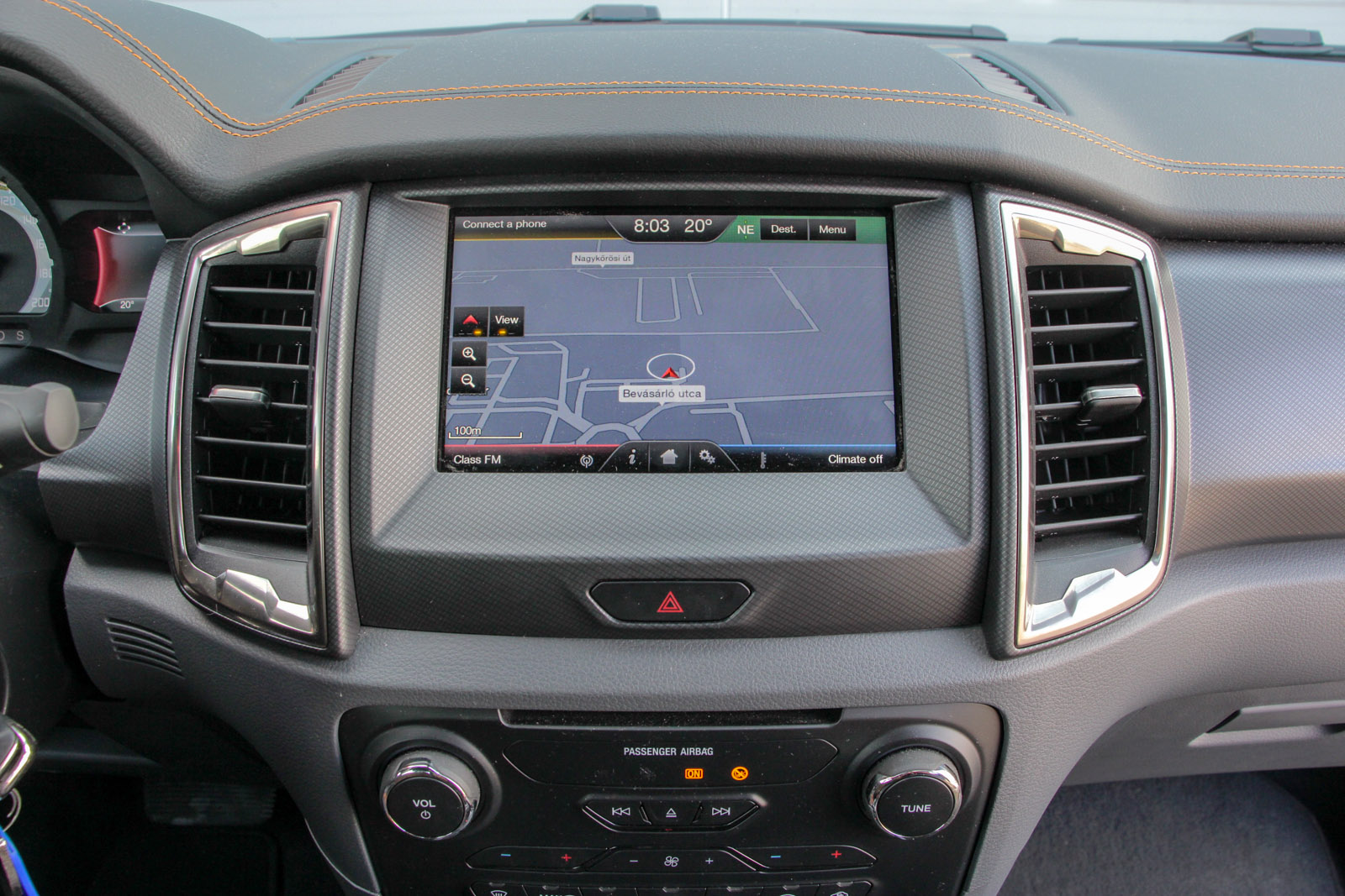 Új arc, új értékek. Érdekes, hogy a Wildtrak a csúcs, mégis szolidabb külsőre, mint a Limited, de ez nem is baj. Orrplasztikán esett át a Ranger, az új lámpák sokkal szigorúbbak a régieknél, viszont még mindig nem LED-esek, csak halogén izzósak, és borzasztóan gyengék, ráadásul nagyon sárgán világítanak. Totál képzavar, hogy erre miért nem figyeltek jobban, nagyon kéne rá rendes világítás. Kívül ennyi az összes változás, nem is lett volna érdemes többet foglalkozni vele, így is fantasztikus a kiállása, leginkább bent frissült. A komplett műszerfal új, a régi béna formák helyett vaskosabb, egyszerűbb felületeket kombináltak, illik is hozzá ez a formavilág. Megkapta a Ford Sync 2-es, hangutasítással is irányítható, érintőkijelzős infotainment rendszerét, aminek a legnagyobb hibája, hogy nagyjából másfél centi mélyen van a monitor, az akciógombokat pedig egészen a szélén jeleníti meg, sokszor csak ujjheggyel érjük el, amit akarunk.
