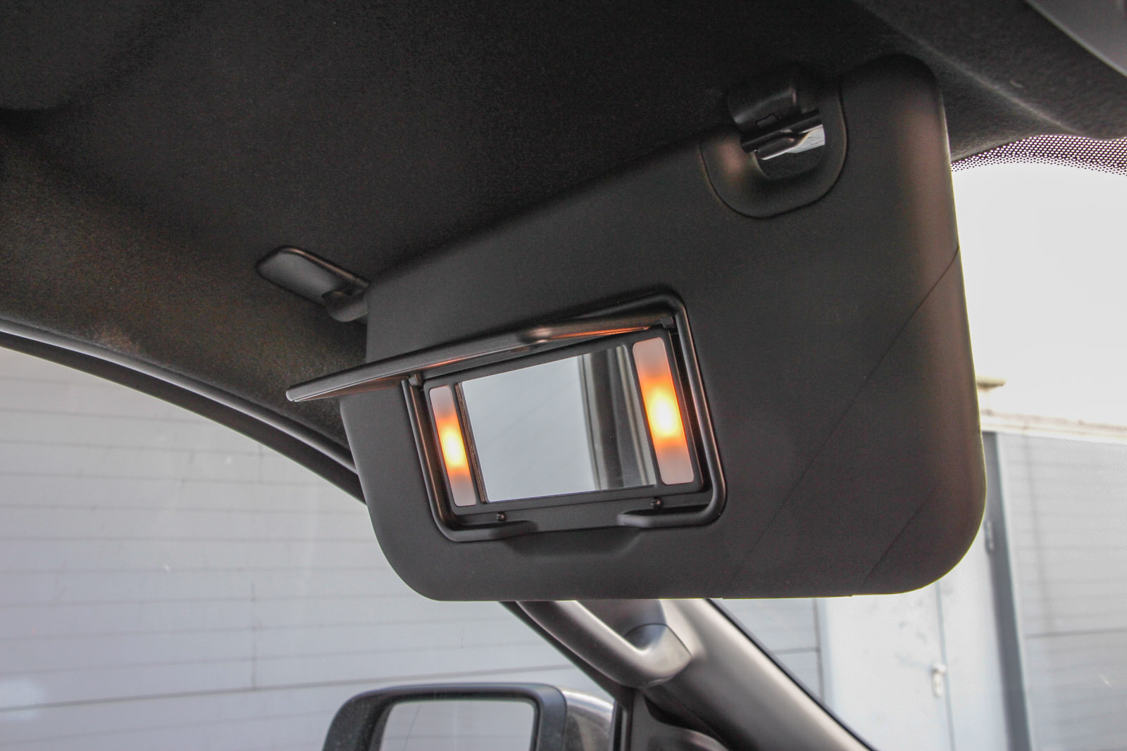 A tükör állítása elég kényelmetlen, de jó esetben csak néhányszor van rá szükség, alatta a fényszóró kapcsolója mellett a platóvilágítást kapcsolhatjuk, érdekes részlet, hogy a sofőr is kapott sminktükröt világítással