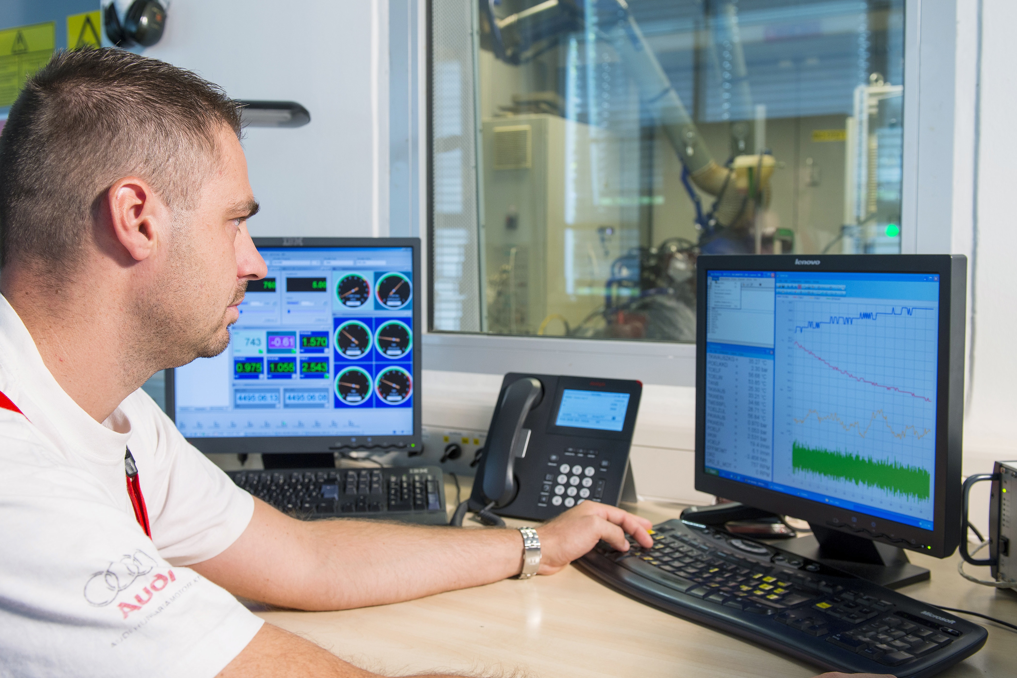 Lényeges, hogy bár Audi-gyárról van szó, a konszern többi márkája is részesül az itt készülő motorokból: 49,1%-ot visznek négykarikás autókba, 22% Volkswageneket hajt, 10,8 %-ban részesül az eredményekből a Skoda, a maradékon pedig a Porsche, a Lamborghini és a cégcsoport kínai partnerei osztoznak. A gyár népszerűségét jól példázza, hogy tavaly 46 000 jelentkező próbált náluk munkát találni, persze sokuknak csalódnia kellett. Ez alkalommal a gyár motorfejlesztő részlegében tehettünk körsétát, kicsit szimuláltunk, fejlesztettünk, vizsgáltunk és elemeztünk, persze csak gyenge képességű ipari tanulók módjára. Ilyen motorfejlesztő központból egyébként 15-öt működtet a cég világszerte, és összesen nagyjából 6000 ember munkálkodik azon, hogy a jövő Audi-motorjai csendesebbek, takarékosabbak, praktikusabbak és kíméletesebbek legyenek. A győri a kisebbek közé tartozik, hiszen míg Wolfsburgban 2000, Ingolstadtban és Neckarsulmban 1600, addig Győrben 170 mérnök dolgozik.