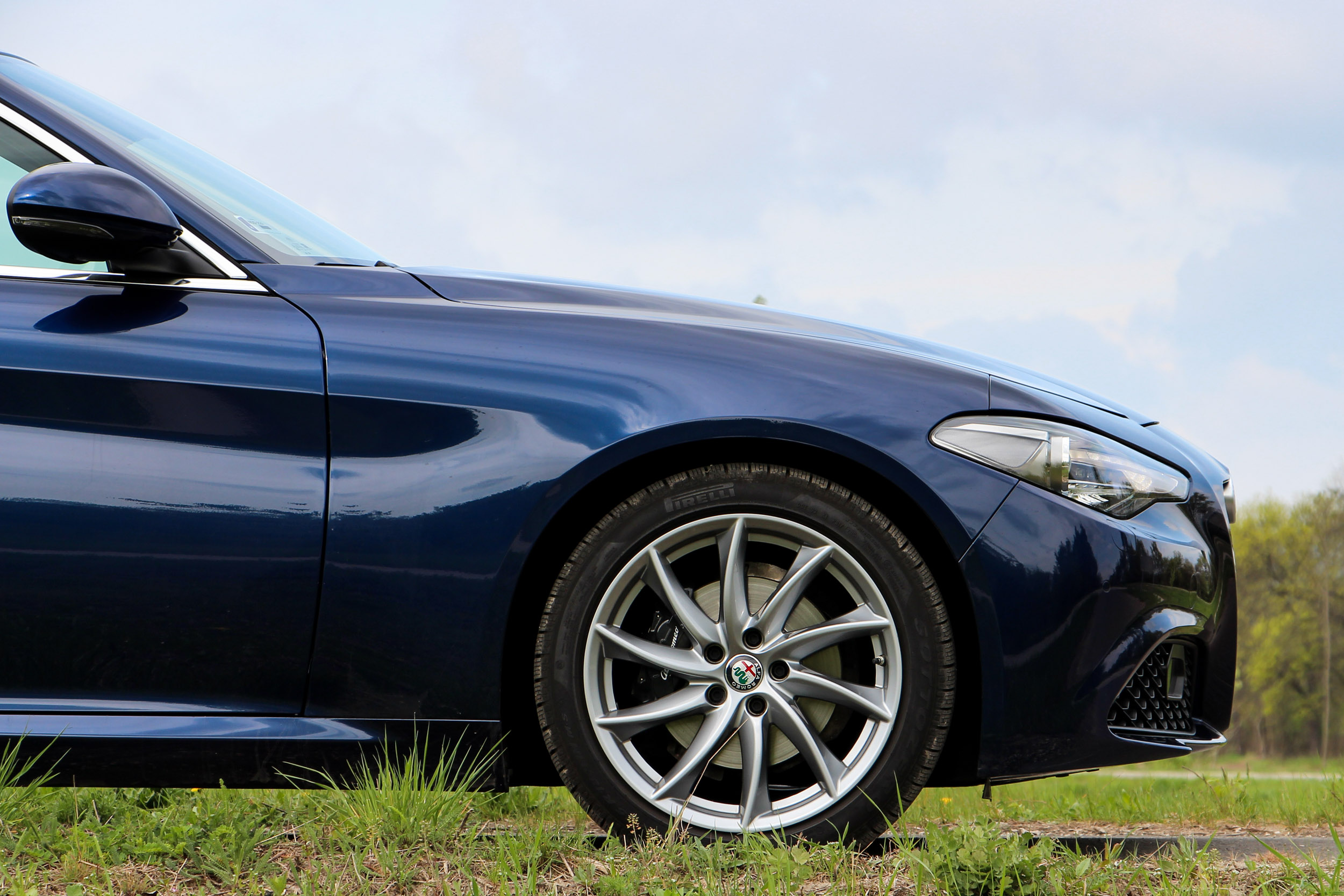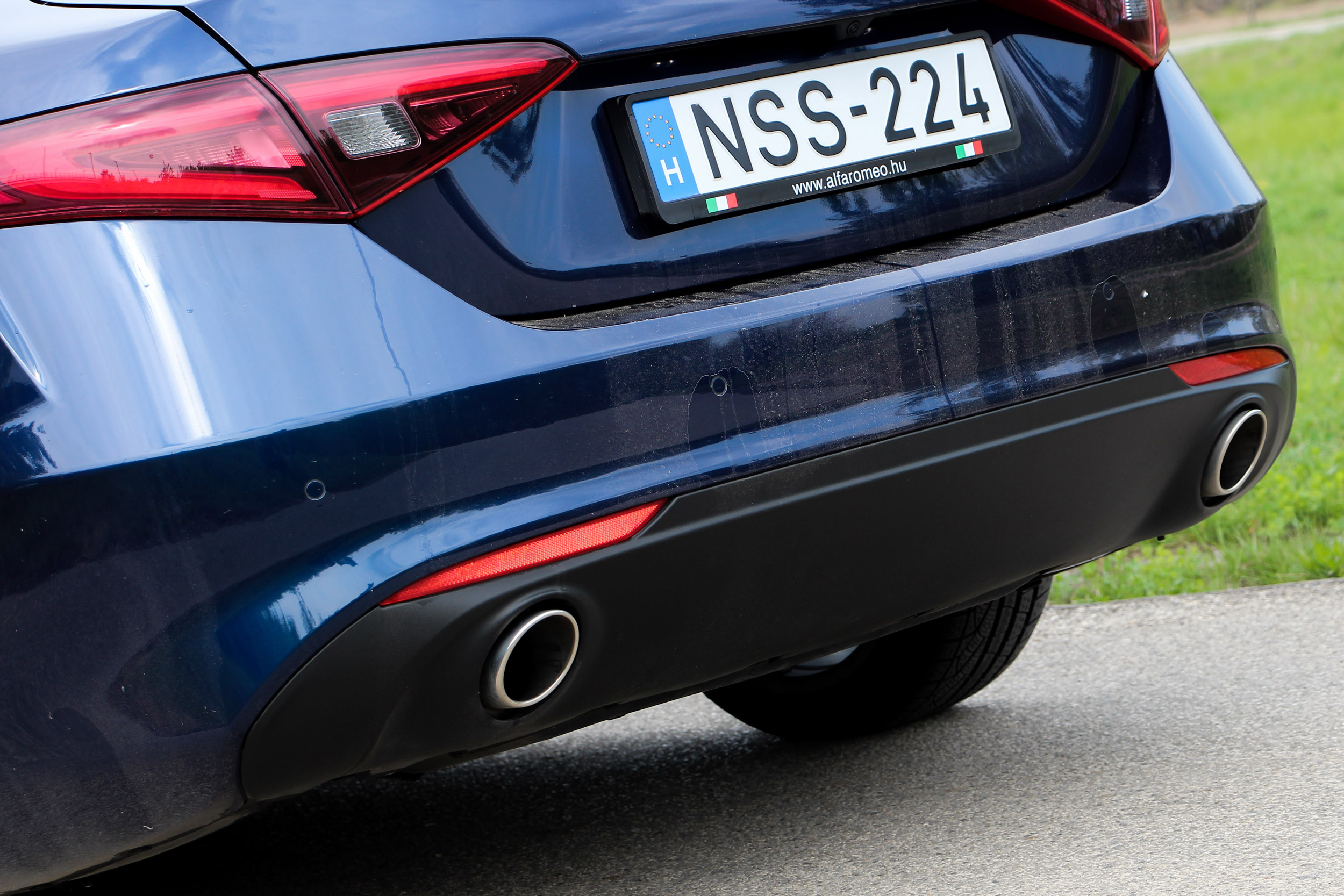 Formás. Annyira érzik az olaszok a formatervezést! A Giulia tökéletes példa rá, hogy még mindig tudják, mi a jó. Nem mentek bele az újra divattá váló szögletes, éles vonalakba, sőt. Egyetlen éles vágást, egyenes vonalat, vagy hajtást nem találunk rajta, annyira gömbölyű, hogy az már nem is igaz. Minden részlete homlokegyenest szembe megy a divattal, annyira jó, hogy egy Alfát még mindig egyedinek terveznek. Nem mondom, hogy nem fordult elő, hogy csak úgy álltam előtte percekig, mert előfordult, minden indulás előtt. Minden elsietett pillantás, amivel ránézünk, pazarlás. Maradt a klasszikus háromszög hűtőrács, csak eltűntek belőle a vízszintes bordák, helyette méhsejt rácsozás van, ettől persze nem fér el a rendszám rendesen, és annak ott is a helye a lökhárító bal szélén. Álló helyzetben is borzalmasan lendületes, amire az elöl-hátul eltérő méretű kerekek is rátesznek. 18-colosak, de a hátsó felnik mélyebbek, 255/40-es abroncsokat hordanak, míg elöl 225/45-ös téliket feszítettek rájuk.