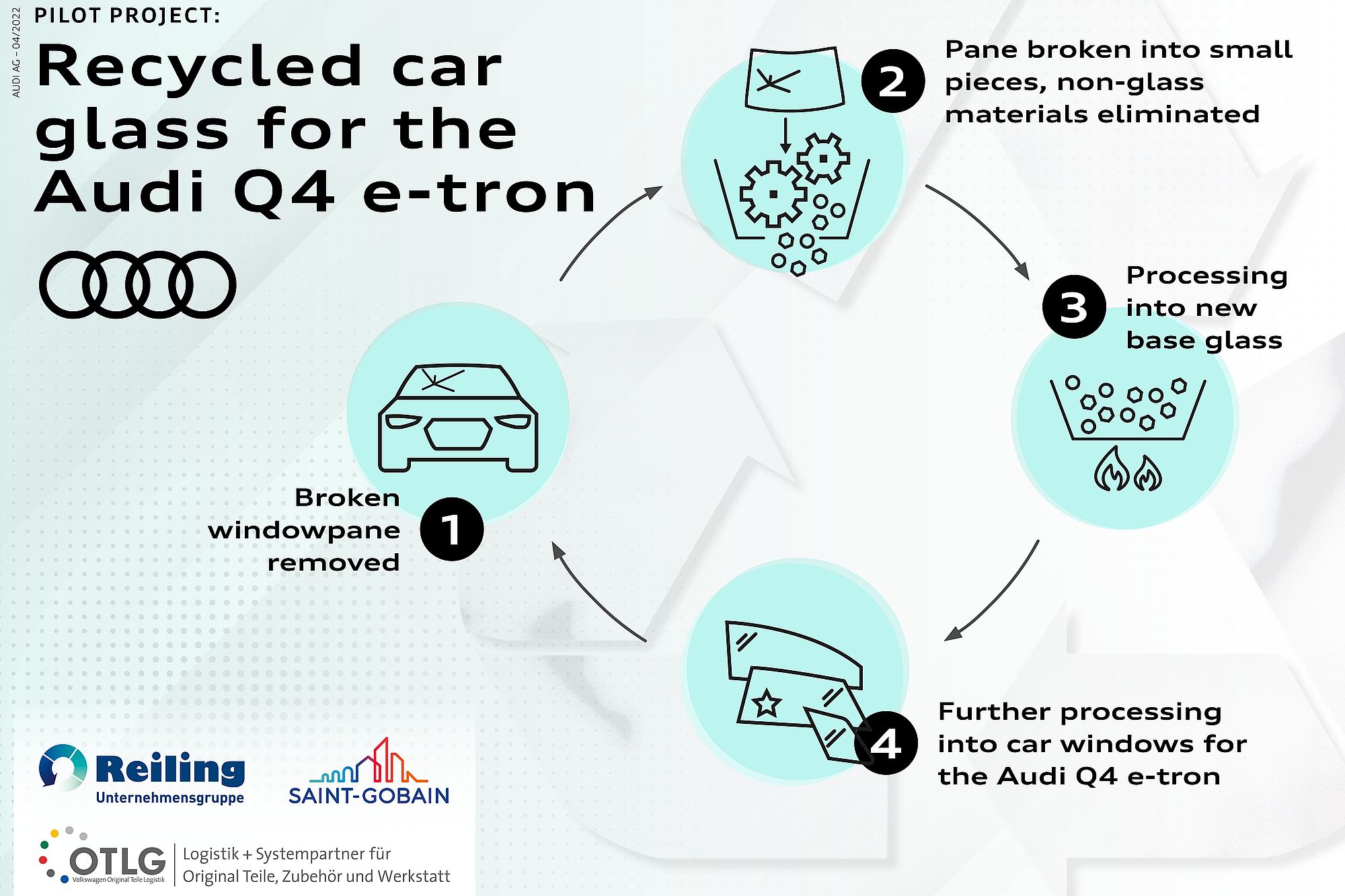 Az Audi és partnercégei egy közös kísérleti projekt keretében a sérült szélvédőket, ablakokat újrahasznosítható anyaggá kívánják alakítani, amelyet aztán új szélvédők gyártása során használnának fel.