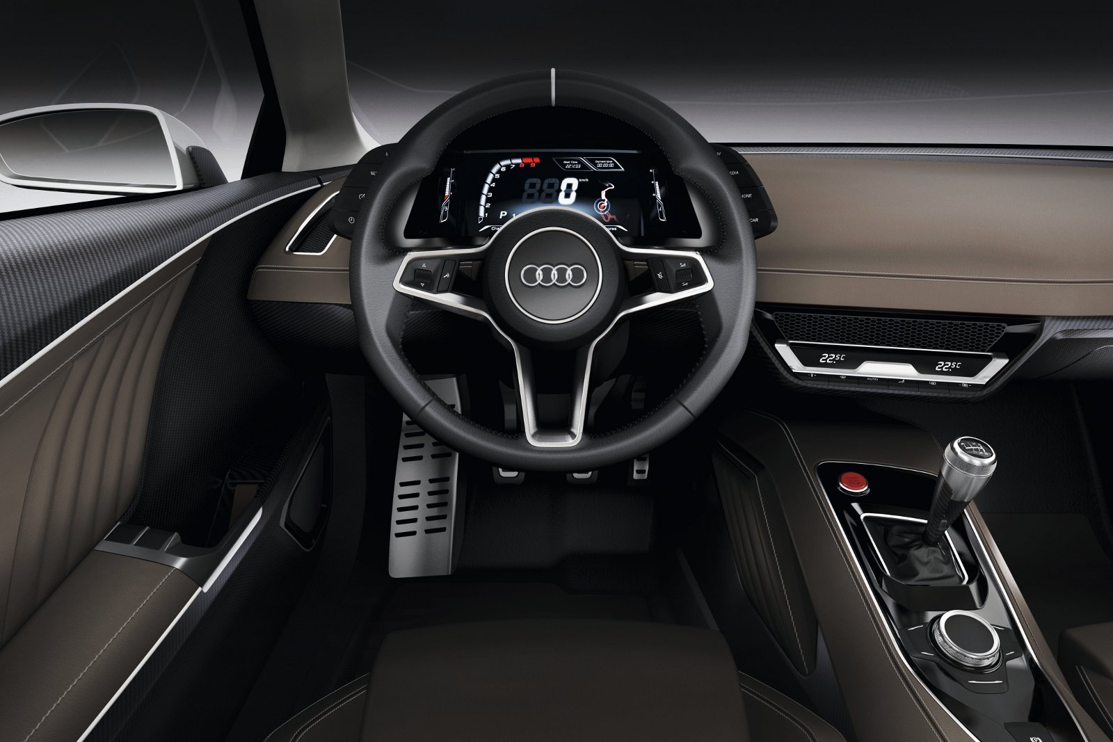Meglepően letisztult lett az utastér megjelenése, ami annak köszönhető, hogy a tömegcsökkentés miatt mindent kihagytak az autóból – vagy leegyszerűsítettek. A sportülések például darabonként 18 kg-ot nyomnak, ami negyven százalékos megtakarítást jelent a normál sportülésekhez képest. A hétköznapi, három pontos öveken kívül négypontos övek is vannak a fedélzeten arra az esetre, ha a sofőrnek ralizni támadna kedve. Ilyenkor egyébként a digitális műszeregység grafikája is átvált, és a nyolcvanas évek rali autójának megjelenését idézi. A műszeregység-takarójának két oldalán lehet vezérelni az időmérőt és az MMI rendszert.