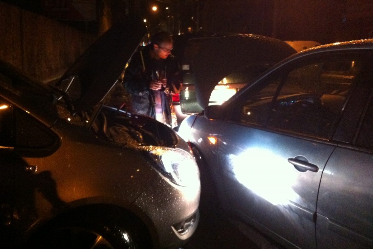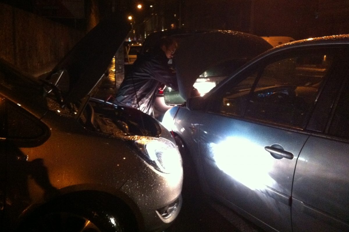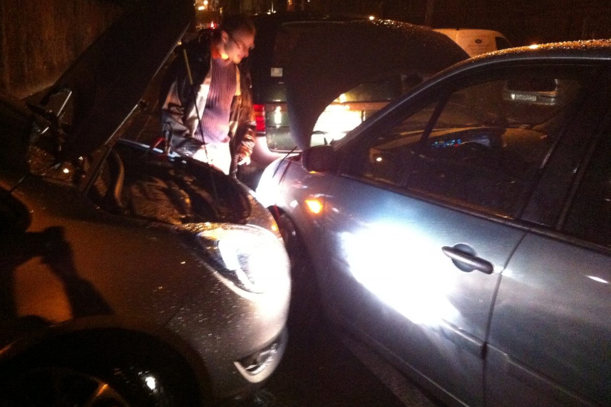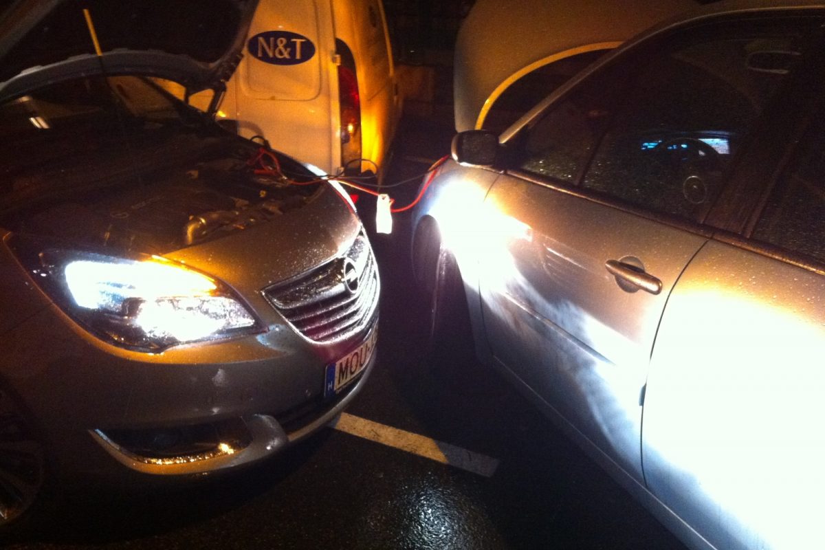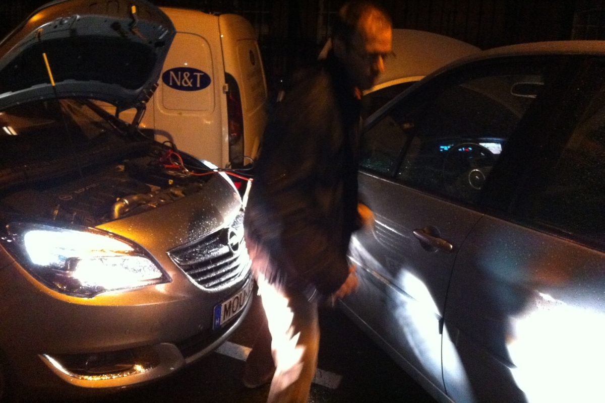 Megvárjuk, amíg épp nem jön egy autó sem az egysávos, egyirányú, amúgy trolibusz-útvonalnak is számító utcán, majd óvatosan leengedjük a Scénicet a járdáról. Úgy, hogy mögötte még elférjenek az autók, s mellé tudjak állni a Merivával a bikázáshoz. Mivel a Scénicben baloldalt van az akku, a forgalommal szembe kell forduljak. Manőverezésemkor épp jön egy mentő - szerencsére nem mentés, rohanás közben, így szerencsére türelmes is. Őt azért gyorsan elengedem, majd megállok úgy, hogy személyautók, furgonok is elférjenek mellettem. Bekötöm a kábeleket. Ugyebár az indító (Meriva) pozitív sarujáról először az indítandó (Scénic) pozitívjára, majd az indító negatívjáról az indítandó egy testpontjára kellene. De a sötétben testpontot nemigen találok, ezért az indítandó autónál is az akku negatívjára teszem a kábelvéget néhány sikertelen test-próbálkozás után. Éledezik a Scénic, de még nem indul. Közben jön egy troli, ami már nem fér el mögöttünk. Beljebb toljuk a Scénicet, a Merivával pedig beállok egy parkolóhelyre az utca másik oldalára.