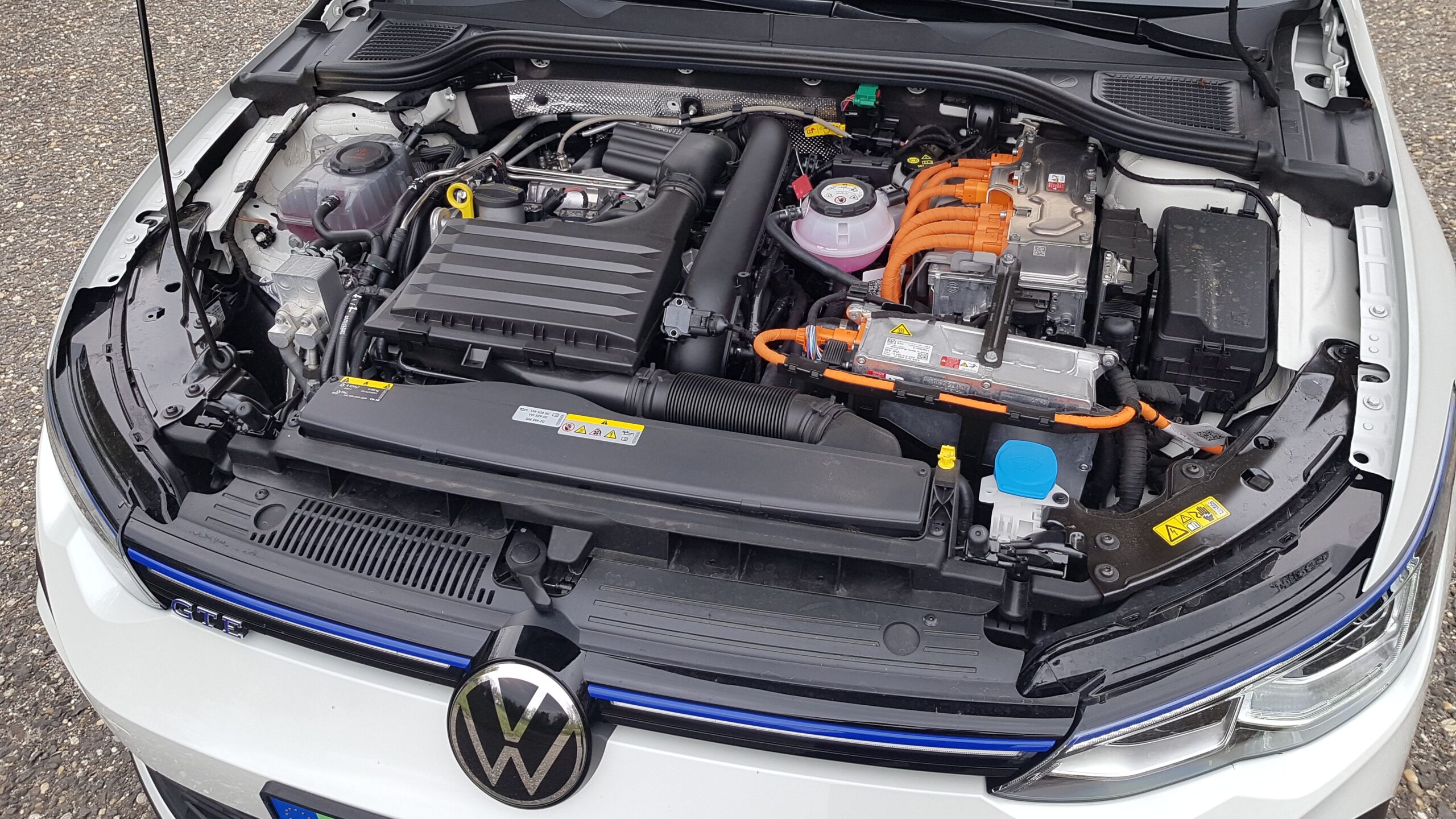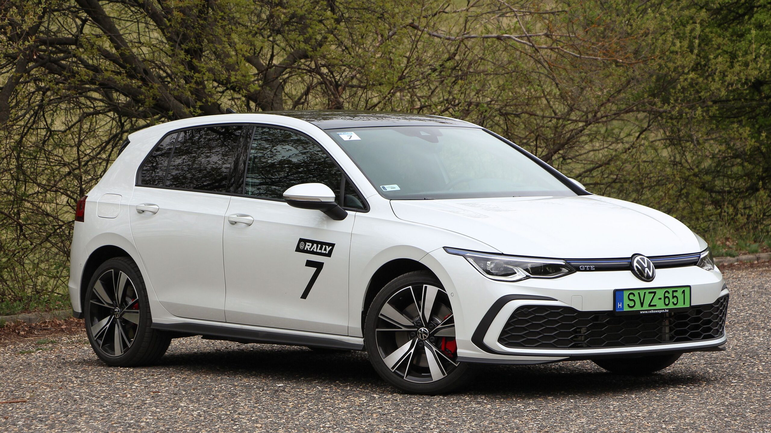 A rajtszám egy rendezvény miatt került rá, a 18 colos felnik mögött virító piros féknyergek szokatlanok egy plug-in hybridtől, de a GTE ezzel is mutatja: ő sportosabb fajta
