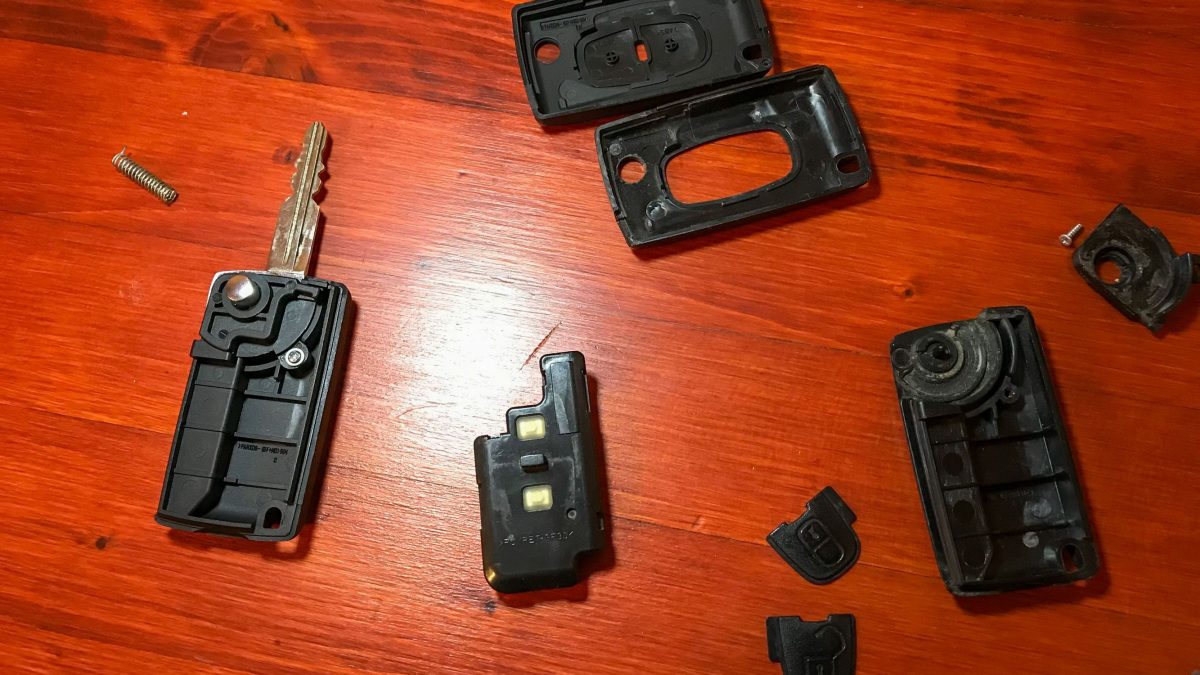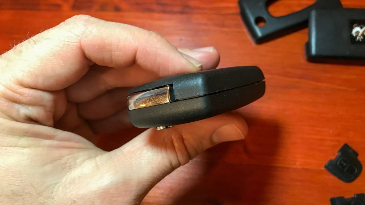 Az első képen balra az új kulcs, amit gyárilag szivaccsal kitömve adnak, jobbra a gyári, amiből a tollat és az elektronikát is át kell pattintani. A szerelés pontosan azért egyszerű, mert a kulcs magától is hajlamos szétesni