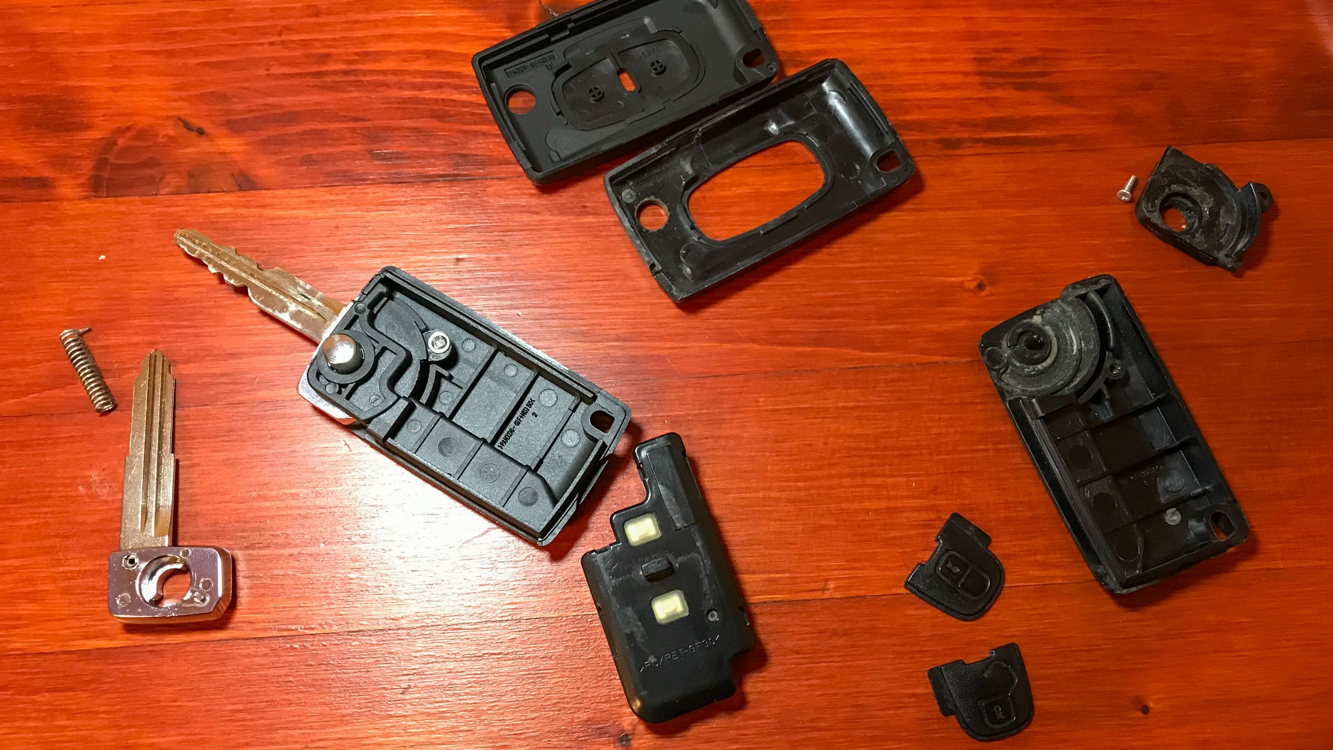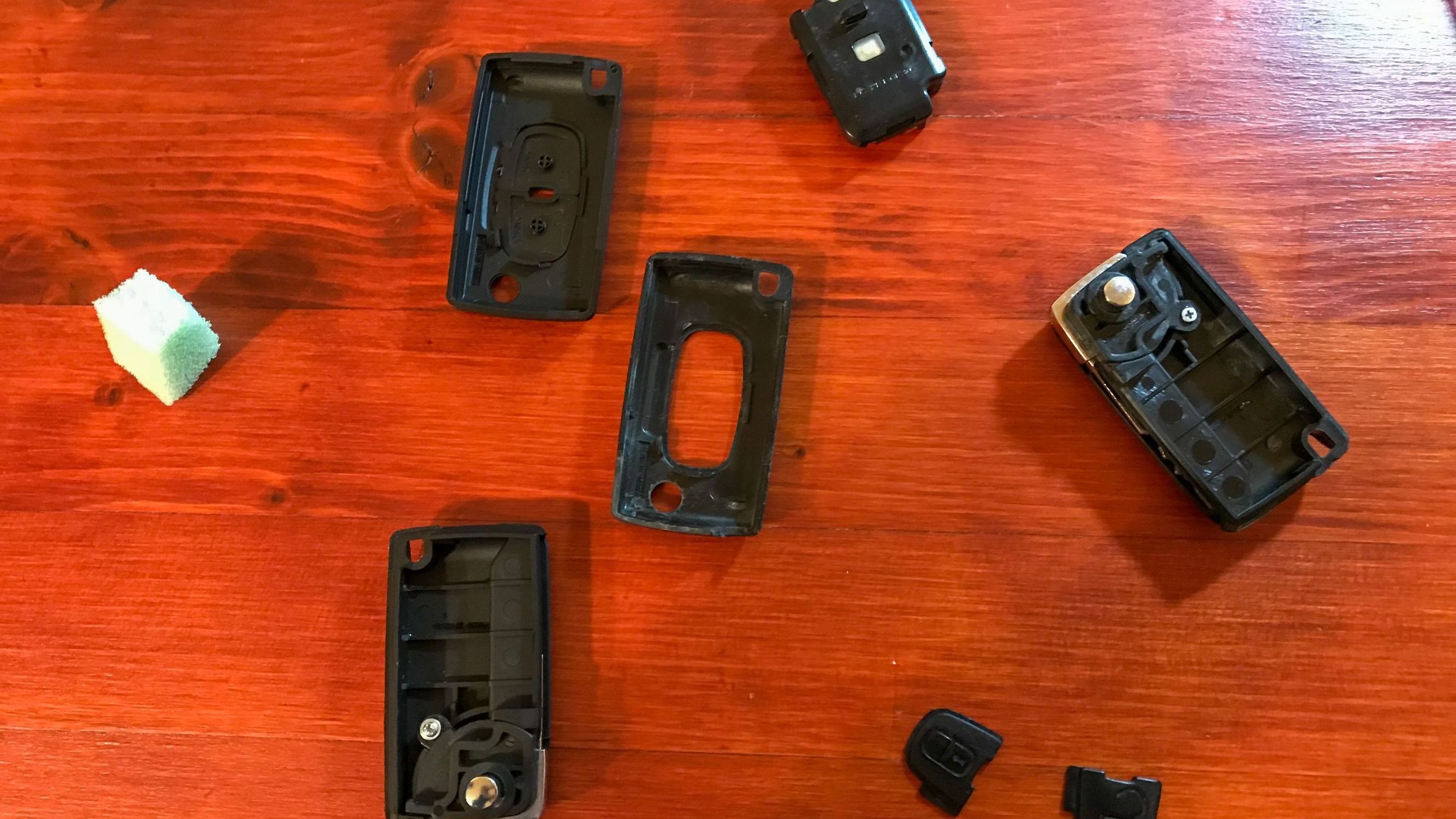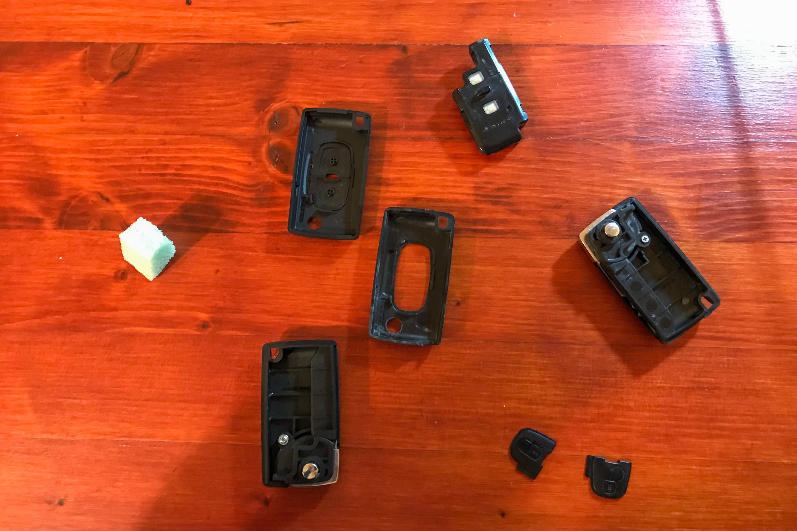 Az első képen balra az új kulcs, amit gyárilag szivaccsal kitömve adnak, jobbra a gyári, amiből a tollat és az elektronikát is át kell pattintani. A szerelés pontosan azért egyszerű, mert a kulcs magától is hajlamos szétesni