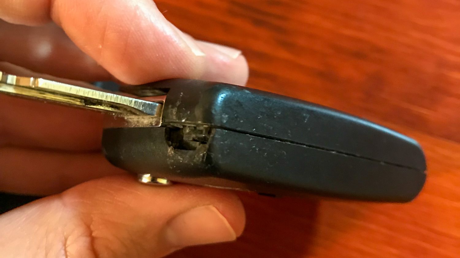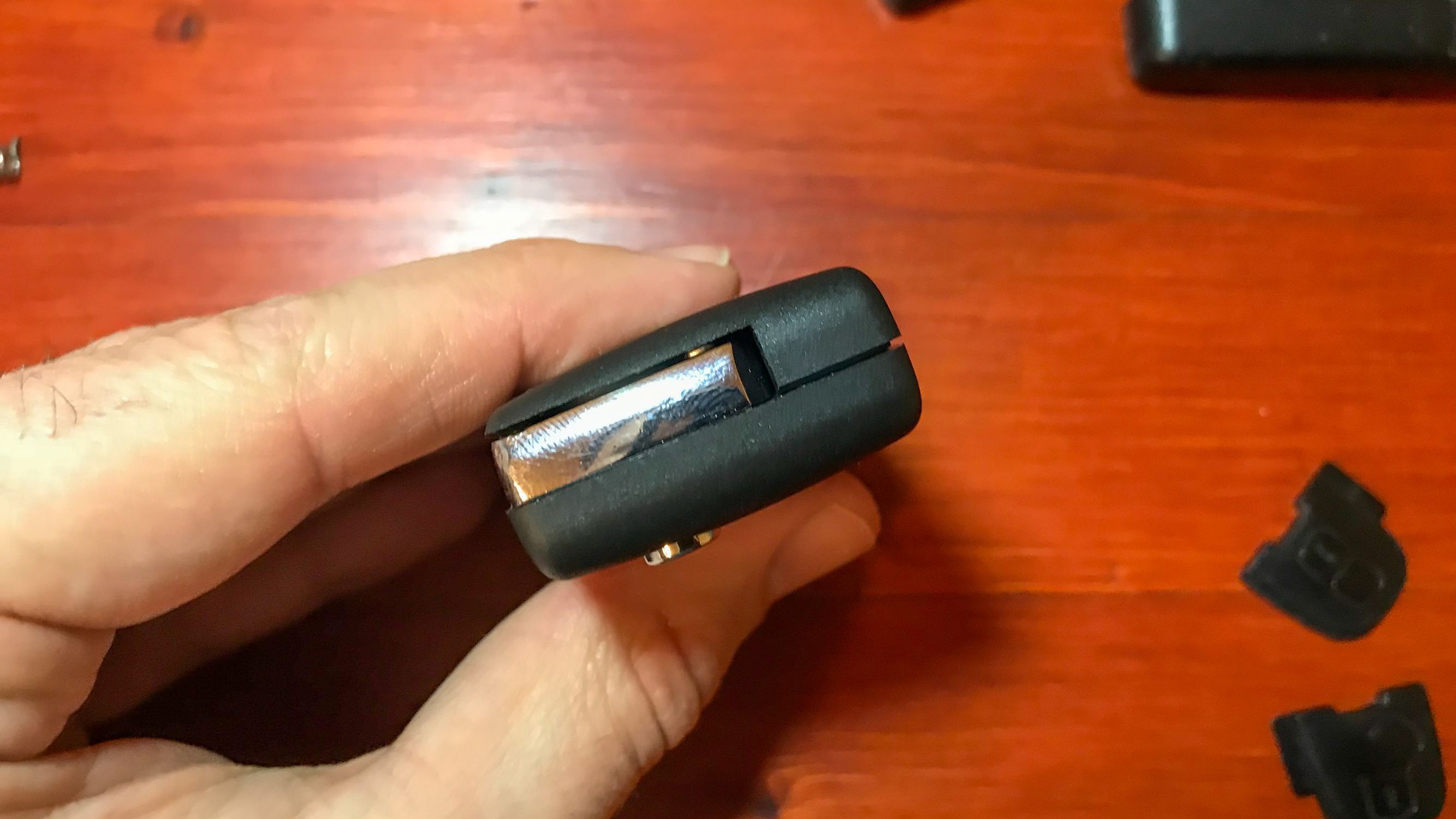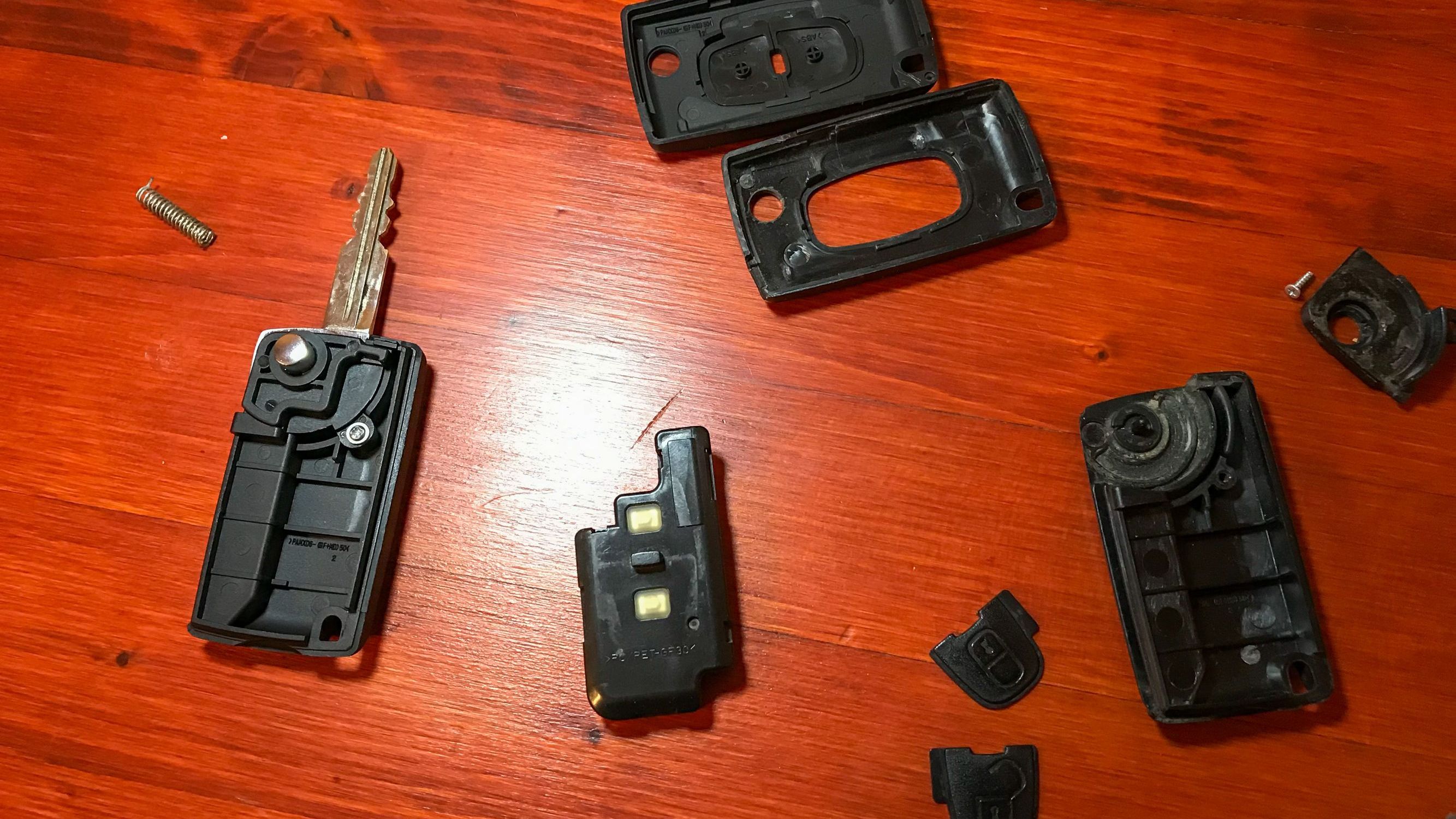 Az első képen balra az új kulcs, amit gyárilag szivaccsal kitömve adnak, jobbra a gyári, amiből a tollat és az elektronikát is át kell pattintani. A szerelés pontosan azért egyszerű, mert a kulcs magától is hajlamos szétesni