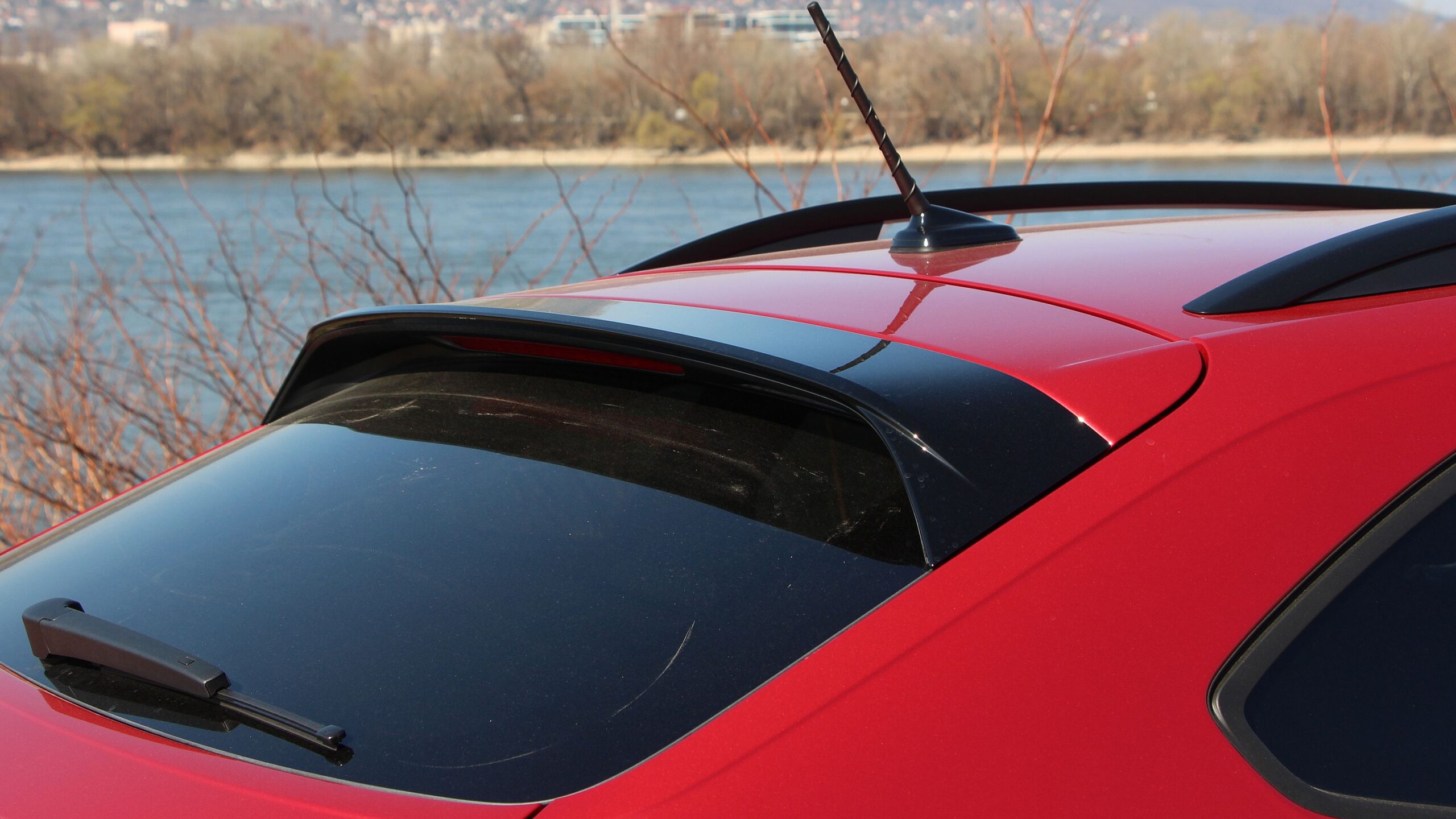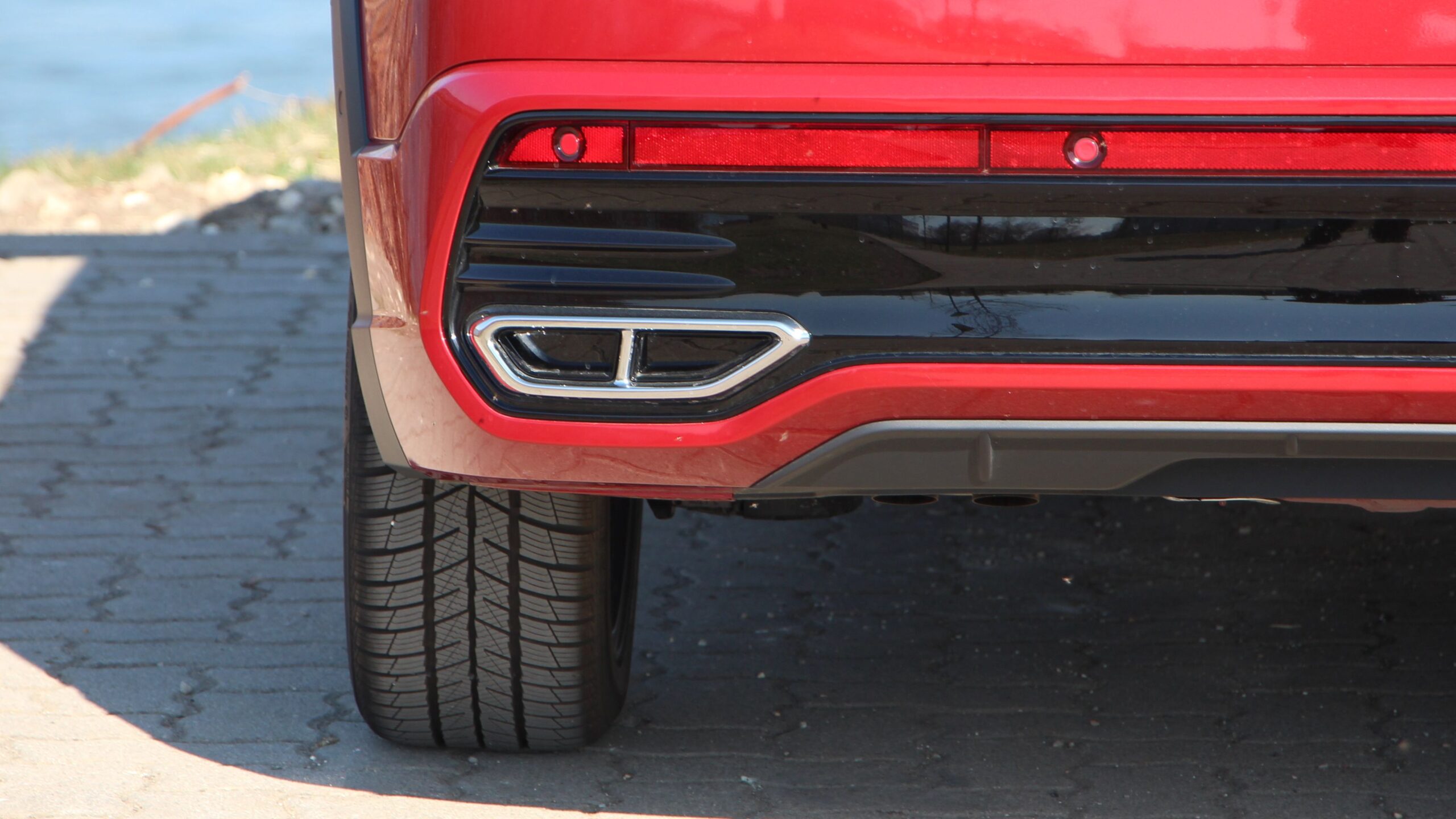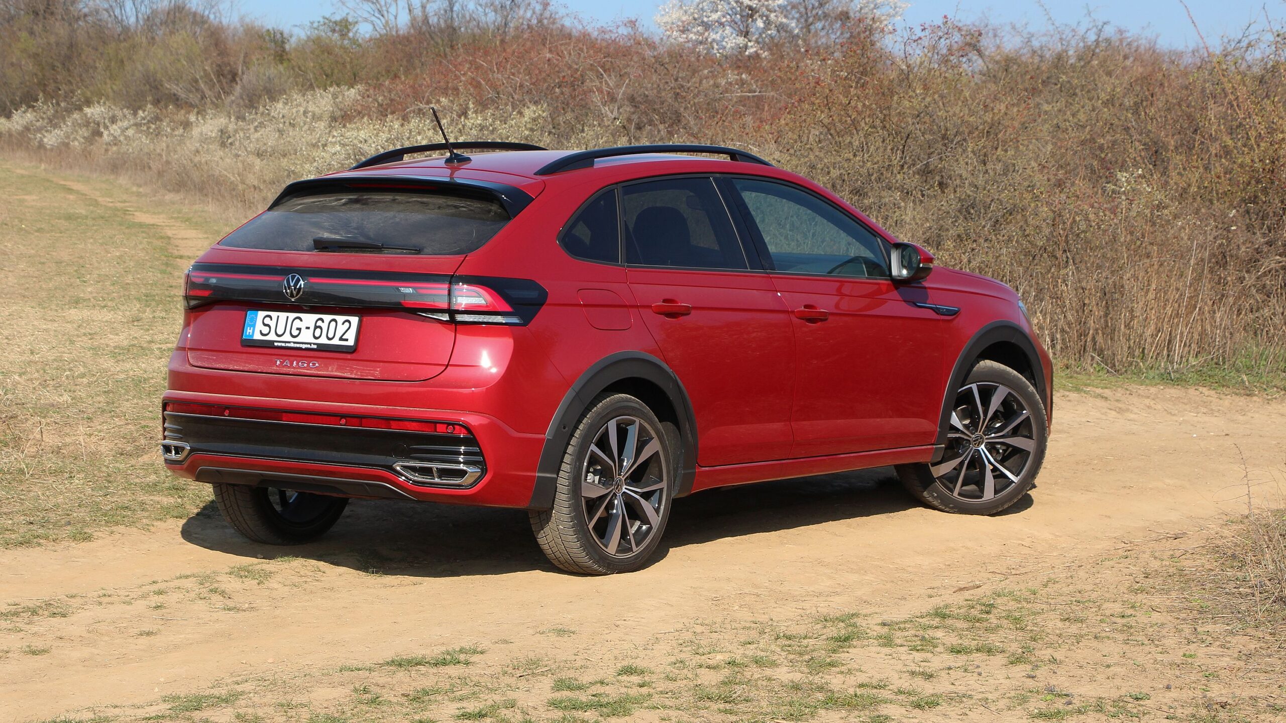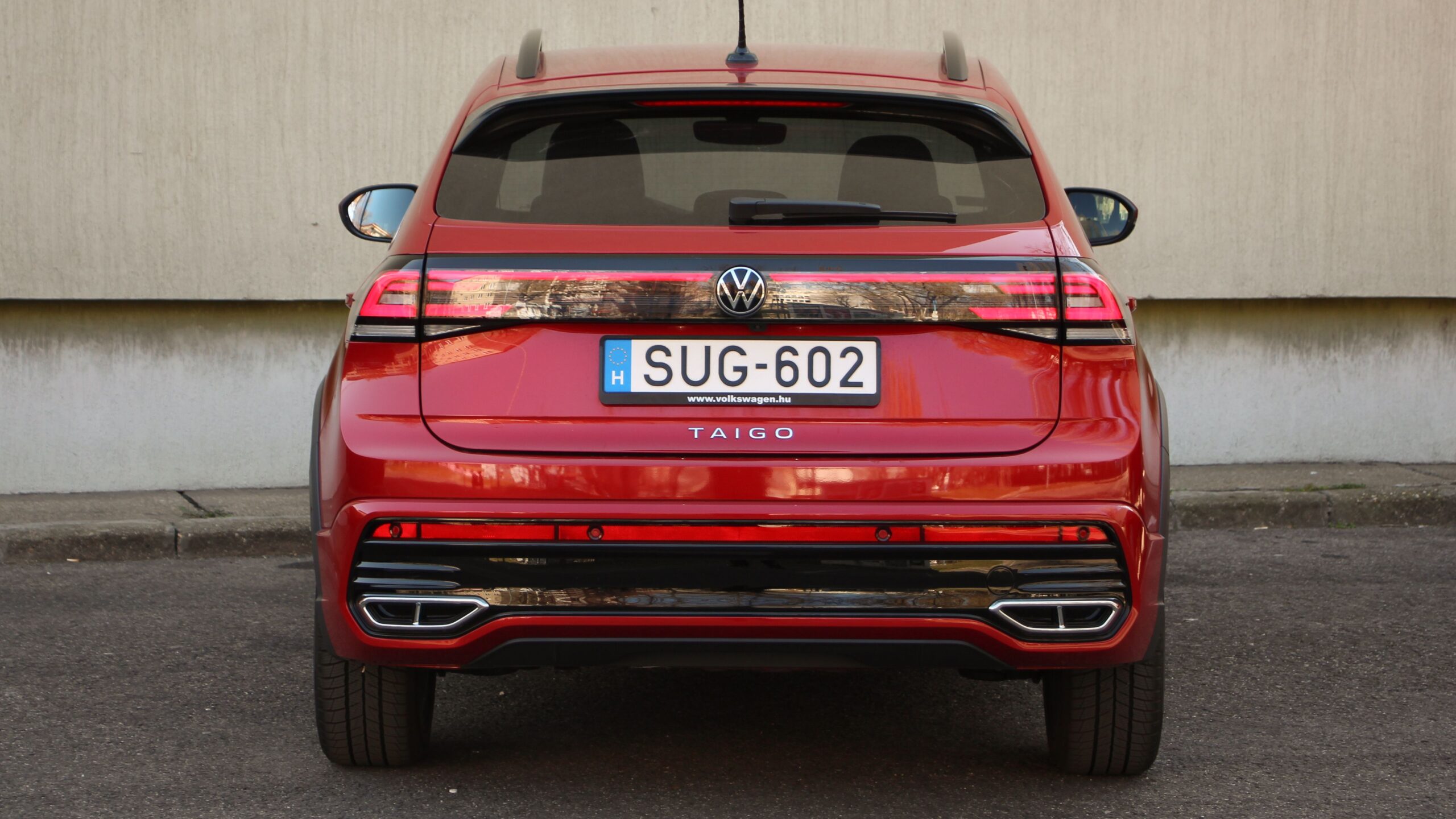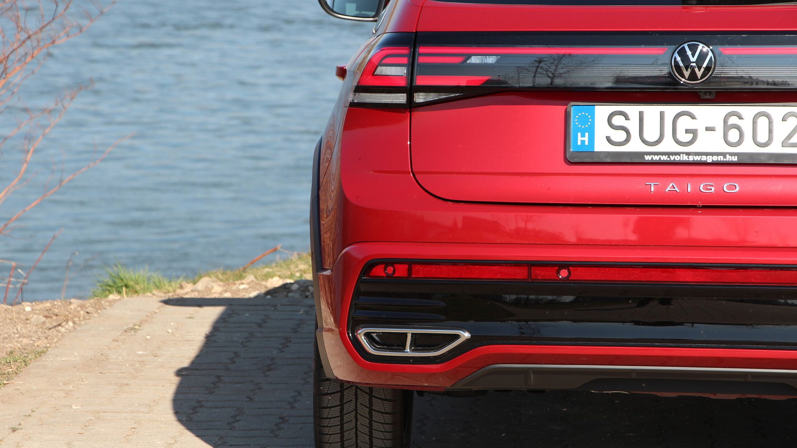 Sőt, még az olyan apróságok is feldobják az összképet, mint a sárvédők fekete betétes R-logója. Az igazi tűzijáték a C-oszlopnál kezdődik. Ha teljesen oldalról nézzük a Taigót, akkor azért nem feltétlenül egy kupé jut eszünkbe, de tényleg látványosan lejt a tető, a legizgalmasabb viszont a hátsó lámpák, illetve az, hogy ezeket fénycsík köti össze. Sötétben kimondottan audis hatást kelt, de a hátsó légterelő és a fekete betétek itt is növelik a látványosság faktort. Az egyetlen, amit nem erőltetnék, az a krómosan csillogó kamu kipufogóvégek.