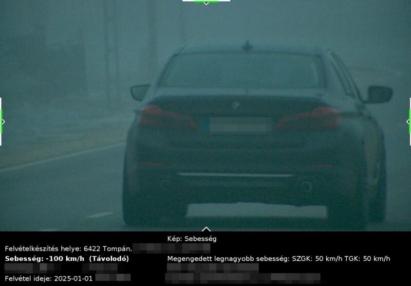 Már január első napján rögzített a rendőrség jelentős sebességtúllépést Bács-Kiskun vármegyében, a konkrét esetben Tompa belterületén. A közzétett fotó alapján a BMW vezetője a megengedett 50 km/óra helyett éppen a duplájával, 100 km/órával haladt el a mérőműszer előtt. Bár a rendőrség nem részletezte, milyen büntetést szabhatnak ki, a jelenleg hatályos jogszabályok alapján minden bizonnyal 140 ezer forintos csekket küldenek majd az üzembentartónak.