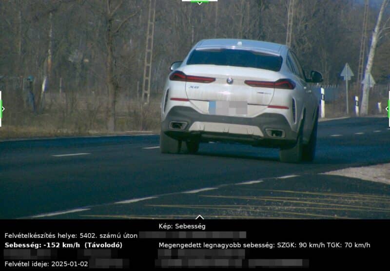 Egy X6-os vezetője az 5402. számú úton gondolta úgy, hogy rá nem vonatkozik a 90 km/órás korlátozás, pechére a rendőrök megörökítették, amint 152 km/órával száguldott. Jó eséllyel ezen autó tulajának is 140 ezer forintos bírság érkezik a postaládájába.