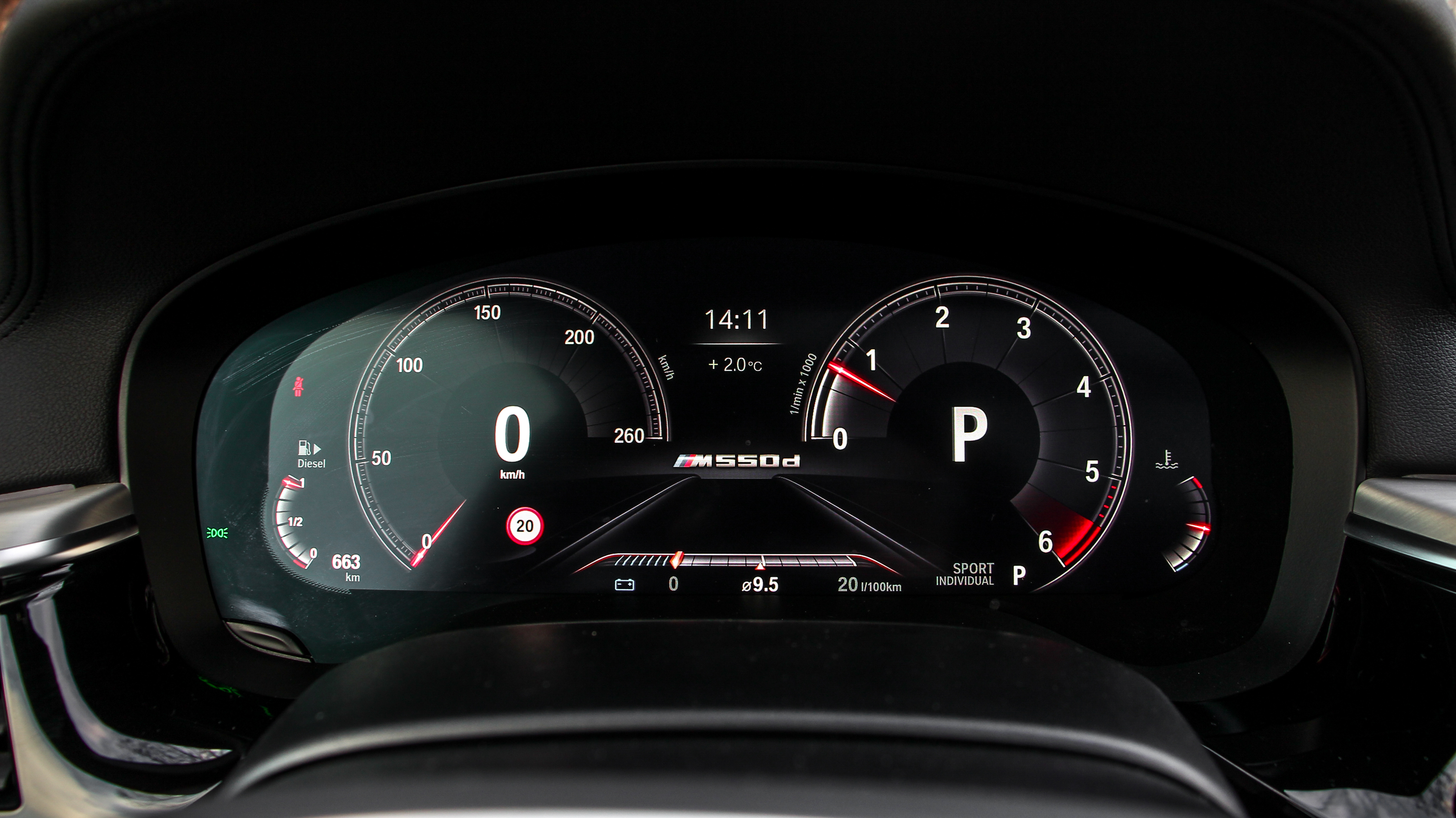 az erő jelentős része a hátsó tengelyre irányul és az 5-ös Touring orra a hajókéhoz hasonlóan magasra emelkedik. Elenyésző kipörgéssel képes elindulni, még a téli gumikkal is szinte elképesztő, amit leművel a rajtnál. Ezek ráadásul most kisebb felnikre is kerültek, az M550d-hez ugyanis 19, vagy 20 colos felnik választhatóak egyedi Cerium Gray fényezéssel, a tesztautón pedig épp fekete téli kerekek vannak.Hangulatos és helyénvaló az alumínium hatású díszbetét, jár az M-es multikormány és a két váltófül, lehet digitális a műszeregység is