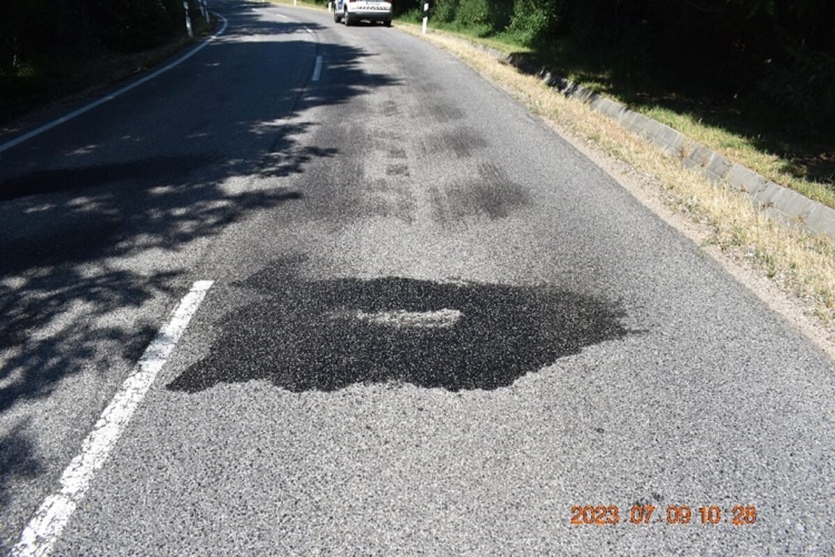 Szétlocsolt olaj egy országúti kanyarban: ez bizony könnyedén veszélyeztetheti teljesen ártatlan közlekedők életét is (Fotó: Police.hu)