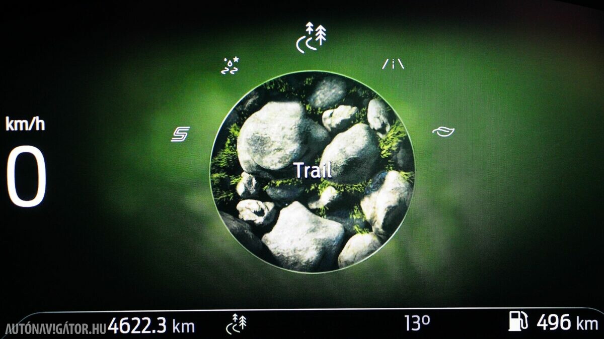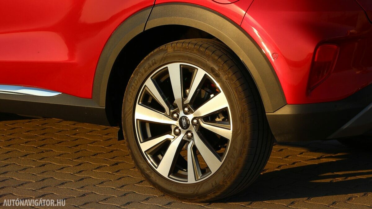 De csapjunk most már szét a 125 ló között is, „akik” az autó orrában dolgoznak. A Titanium felszereltségű modell is ugyanazt a háromhengeres, egyliteres, 48 voltos könnyű hibrid hajtásláncot kapja, mint a sportosabb változat. Hogy őszinte legyek, egyáltalán nem éreztem gyengébbnek, mint a 155 lovas változatot. Az 1,3 tonnás autó mozgatásához ennyi is bőven elég, a váltósegéd gyorsan kéri a magasabb fokozatokat Normal és Eco módban, sőt egyenletesen haladva az 1-es hengernél a befecskendezést és a gyújtást is szünetelteti a spórolás végett. Ezekkel a trükkökkel 6,2 litert kért vegyesben százon, ami érdekes módon picit több, mint amit az ST-Line esetében (kerek hat liter) mértünk, de ebből is látszik, hogy sok múlik a vezető jobb lábán. Illetve azon, hogy milyen gyakran próbálgatja a Sport módot, vagy a terepjárást. Akarom mondani a telekjárást, mert ennél többre nem érdemes vállalkozni. Főleg nem olyan sportos abroncsokkal, mint amit a tesztautóra szereltek. A 18 colos könnyűfém felniken ugyanis Goodyear Eagle F1 gumik feszültek, amelyek imádnivalóak, amikor hegyen-völgyön keresztül haladunk, de a meredek, poros földutakon nehezen kapaszkodik meg, hiába a Trail mód.