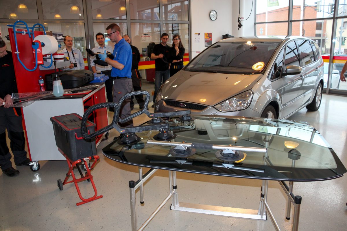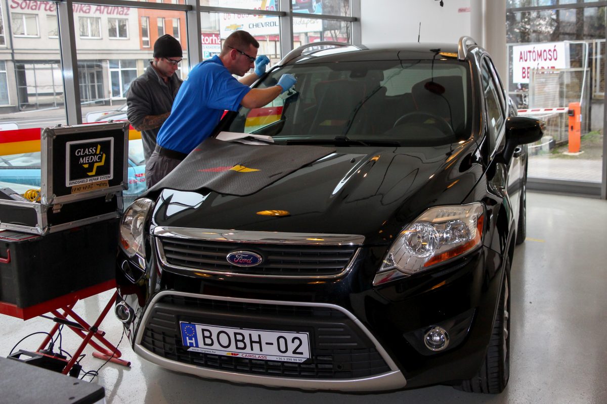 Bravúros, de a Carglass eszközeivel akár a képen látható Ford S-MAX hatalmas szélvédője is egyetlen ember által cserélhető. Az oldalablakokra tett tappancsokkal hajtható helyére az új, már ragasztóval bekent üveg. A karosszériára egy aktivátor anyag kerül, szükség esetén rozsdamentesítés és festés is szükséges lehet