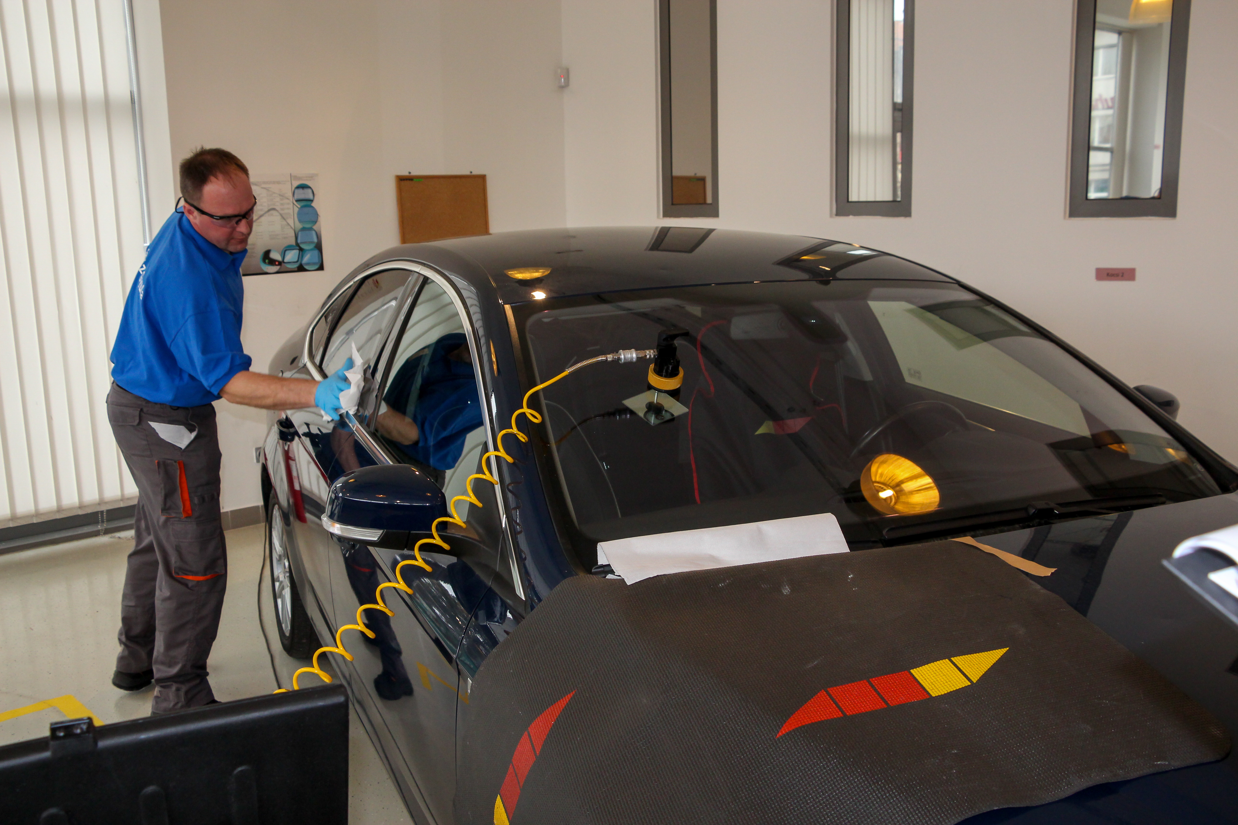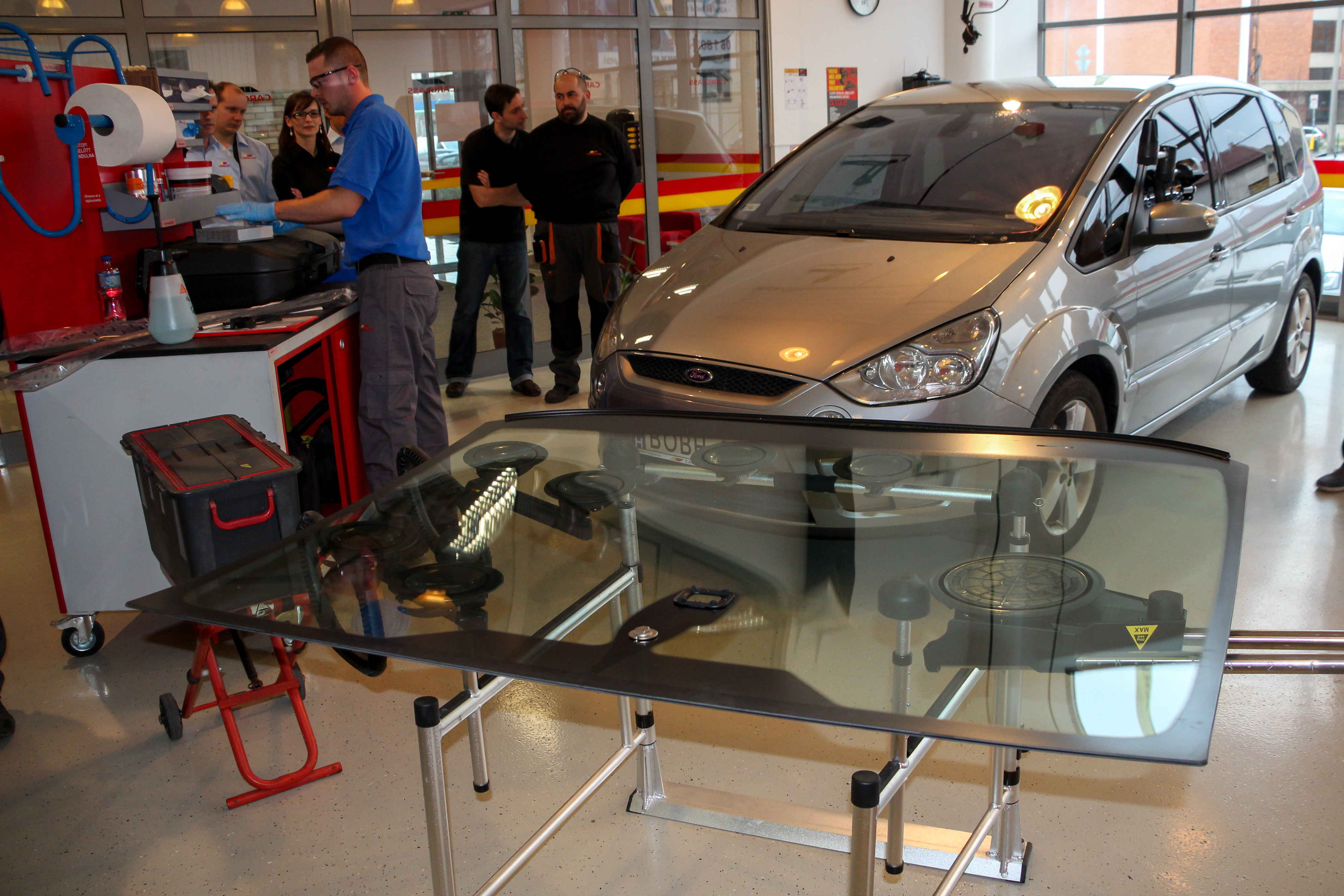 Bravúros, de a Carglass eszközeivel akár a képen látható Ford S-MAX hatalmas szélvédője is egyetlen ember által cserélhető. Az oldalablakokra tett tappancsokkal hajtható helyére az új, már ragasztóval bekent üveg. A karosszériára egy aktivátor anyag kerül, szükség esetén rozsdamentesítés és festés is szükséges lehet