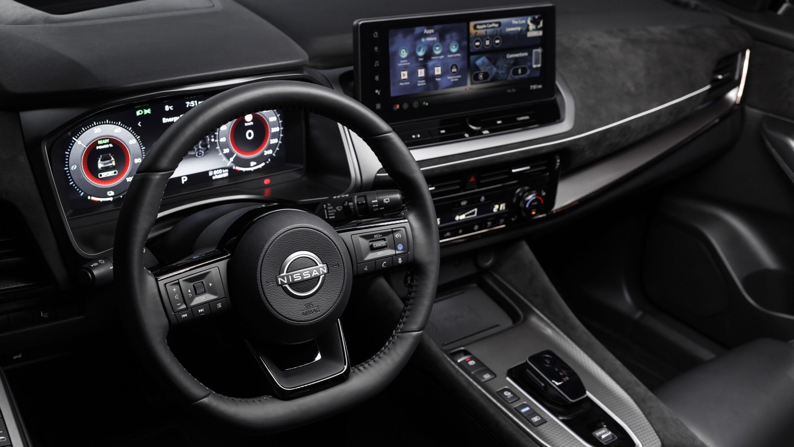 Bent az utastérben csupán kisebb változásokat eszközöltek. Magasabb felszereltségi szinteken immár Alcantara bevonatot kap a műszerfal, az ajtóbetét, a középkonzol könyöklő része, de még a térdpárnák is. Európában a frissített Qashqai az első modell, amely megkapja az Google alapú multimédiás rendszert, így a techóriás fiókjába belépve elérhetővé válnak a Mapsben rögzített kedvenc helyek, nem szükséges az autót összekötni az okostelefonnal.