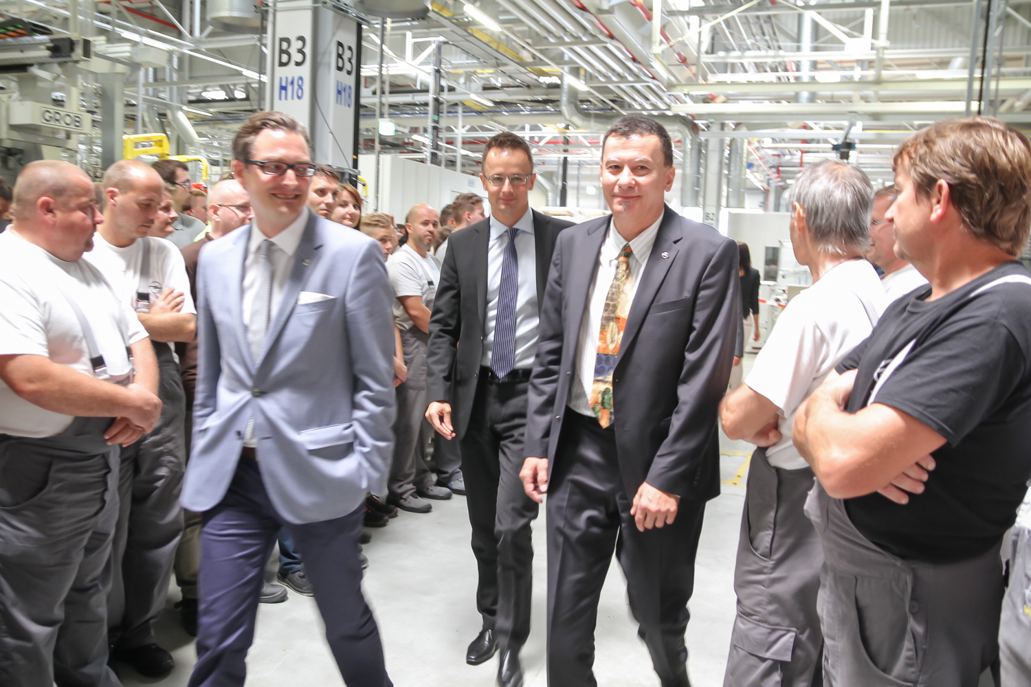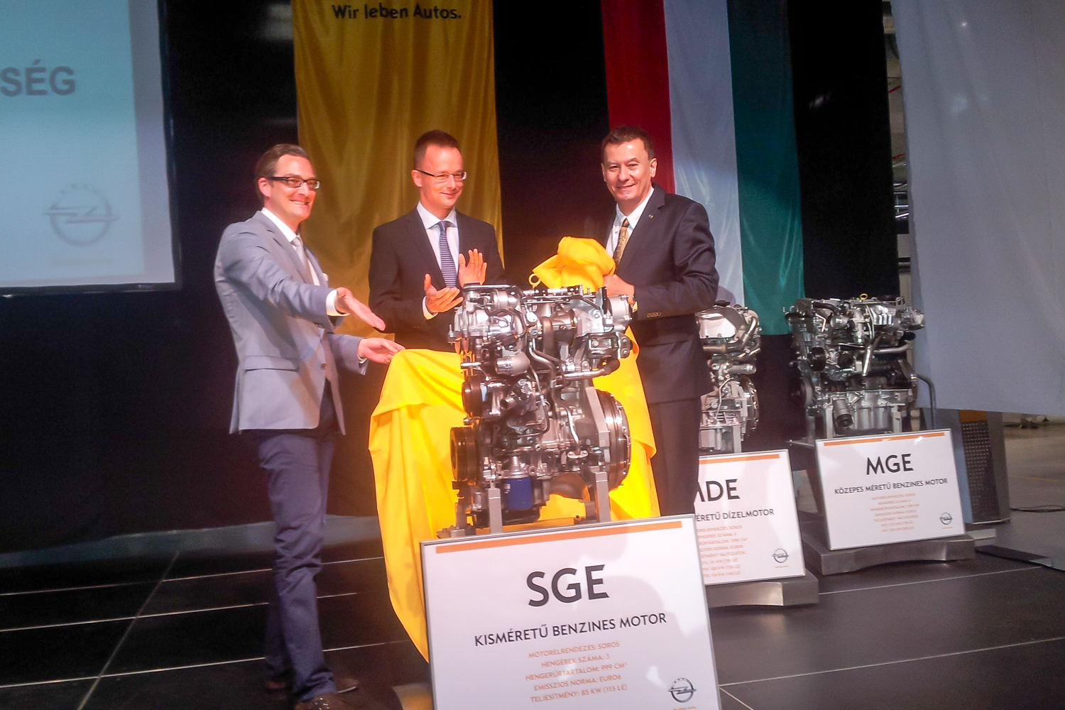 Joachim Koschnicke Opel alelnök, Szijjártó Péter külgazdasági és külügyminiszter-helyettes és Solt Tamás az Opel Szentgotthárd igazgatója leplezték le az új szentgotthárdi háromhengerest