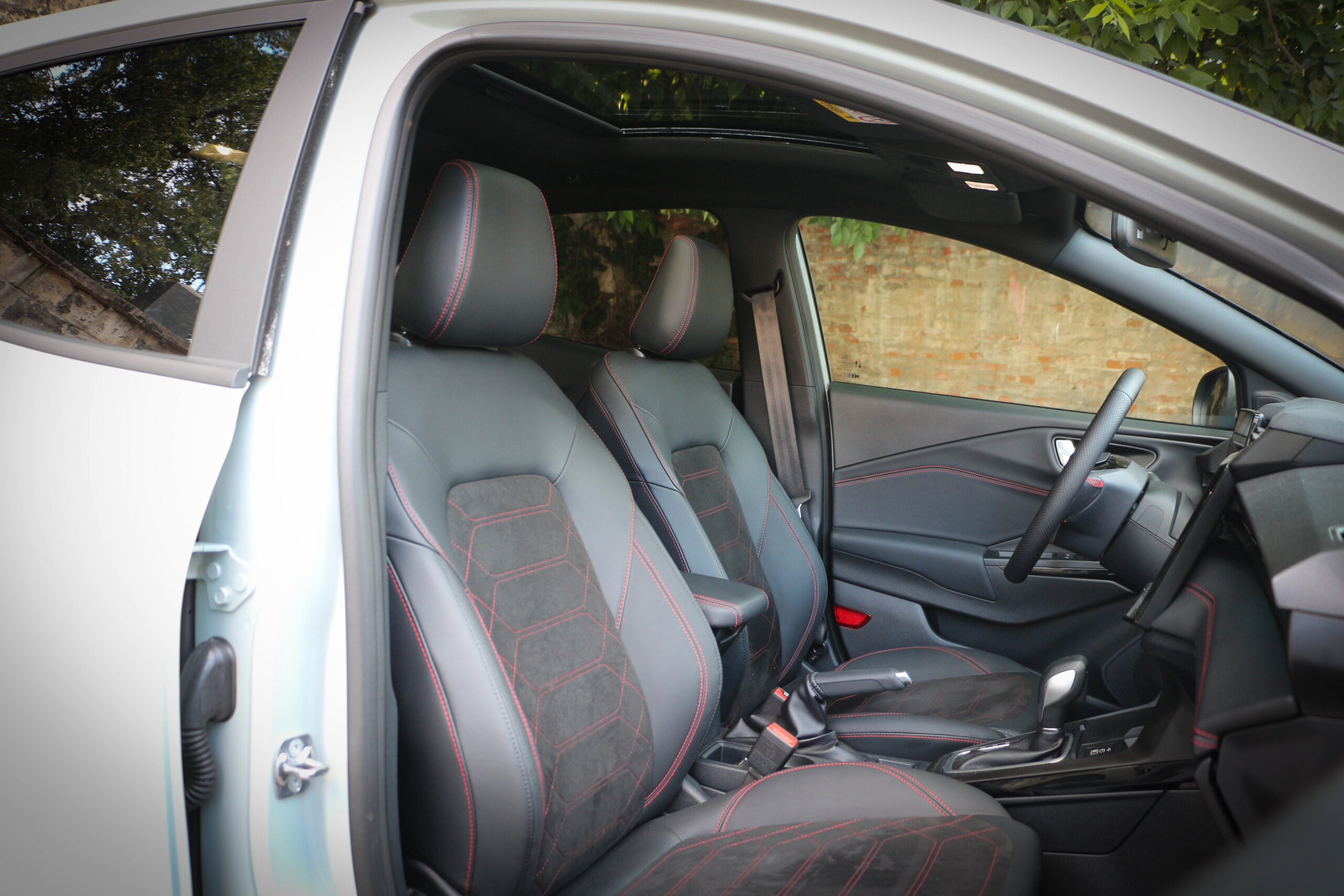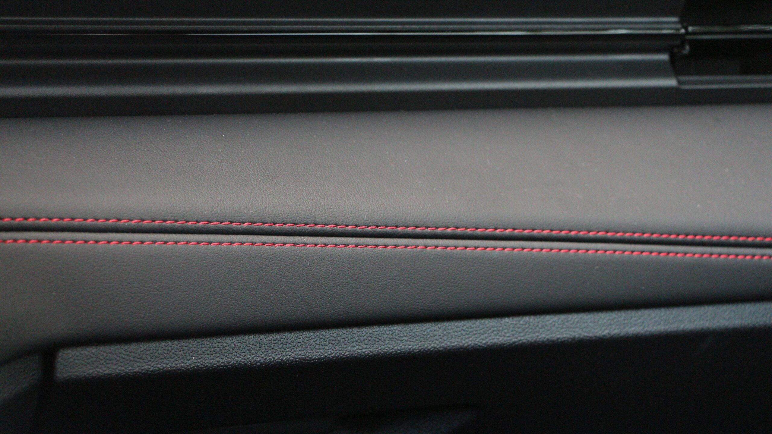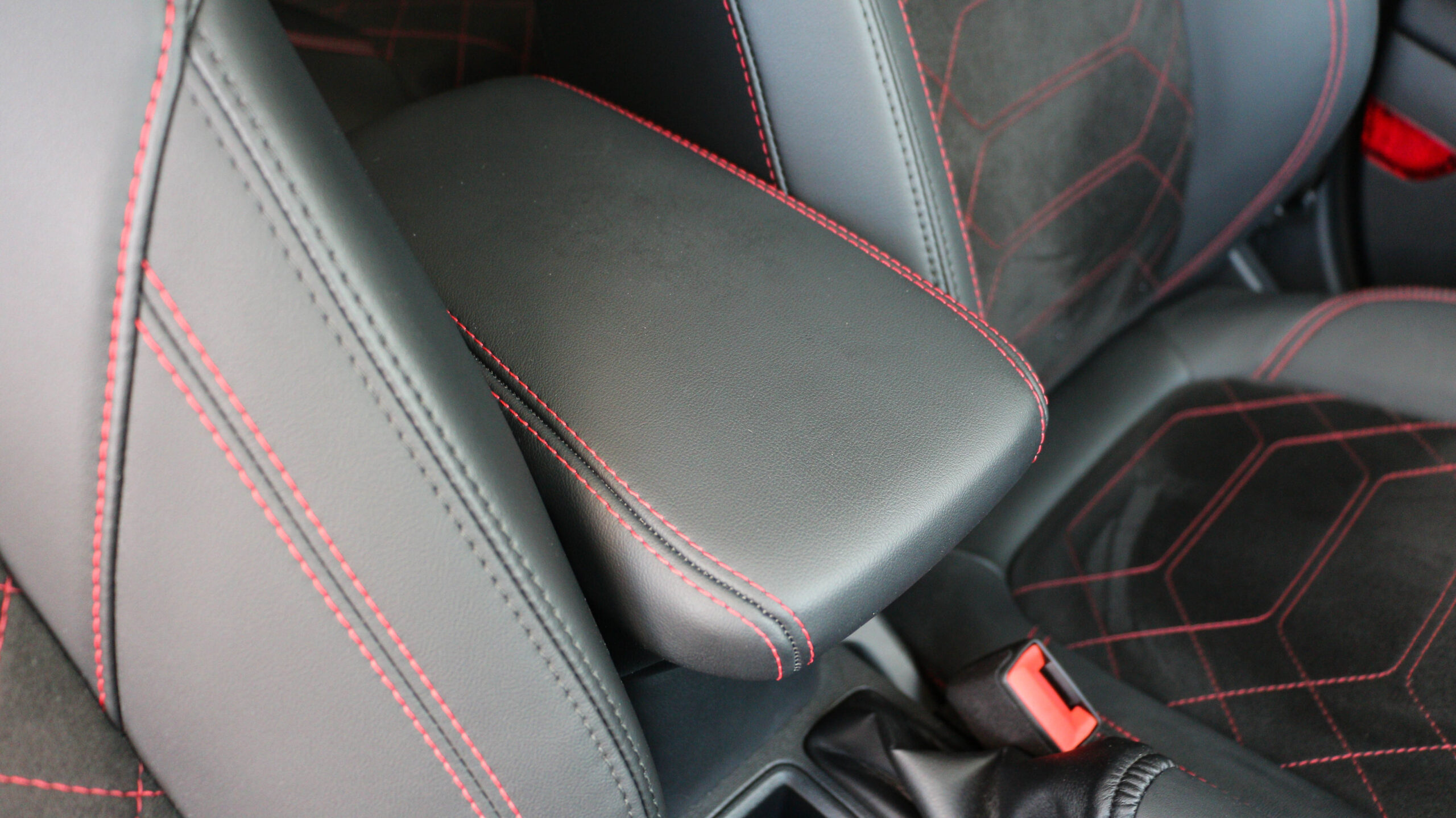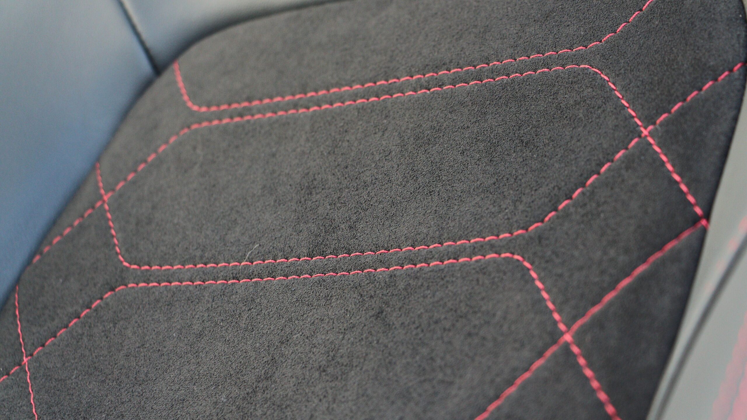Az Alcantara hatású ülések varrásaihoz piros cérnát használtak, és az ülőlapra is jutott díszítés