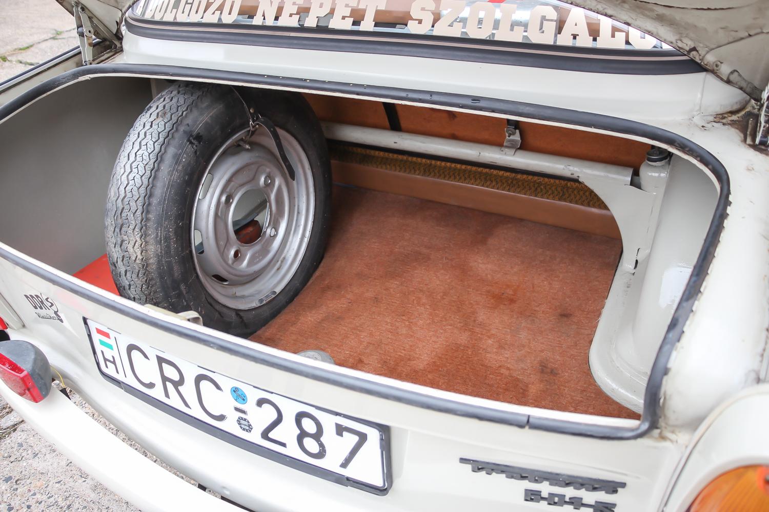 1986-os, de még pont nem tekercsrugós, hanem a jó, negatív kerékdőlésért felelős kereszt-laprugóköteg van alatta. Gyakorlott trabis balra rakja a kisebb holmikat, a keréktől jobbra meg a nagyobb táskákat. Az izzókészlet és a többi tartozék is korhű
