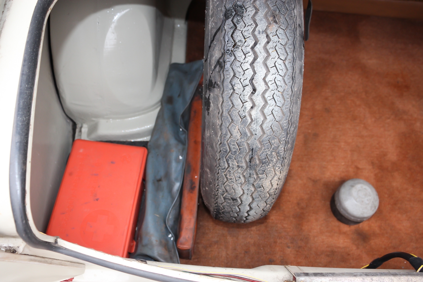 Korabeli a valódi bőrburkolat a kormányon, a bakelitkarima repedése meg típussajátosság. Látják azt a kis bibircsókot a lábtér közepén? Na, az a gázpedál, amit akár az anyós is taposhat. A belógó doblemezek miatt csak így tudták megoldani a padálok elhelyezését