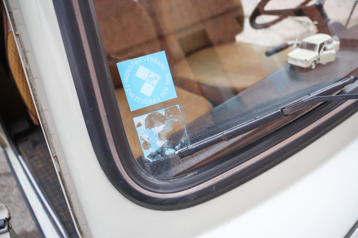 A kerek fényszórók már halogének, a villanyászat már 12 voltos, jól áll a sárgítás a Trabicseknek. Az eredeti IFA matrica és fölötte az egyedileg legyártatott új a szélvédő tövében. A csomagtérajtó a zsanér holtponton áthúzásával fixálható