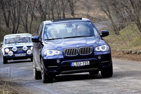 Citroën 2CV furgonomnak pedig lejárt a műszakija, így sajnos élnünk kellett azzal a kivételes lehetőséggel, hogy edzés lévén bármilyen, akár új autóval is rajthoz lehetett állni, évjáratmegkötés nélkül – így neveztük be az éppen tesztüzemben nálam lévő BMW X5 xDrive40d modellt. Nem tagadom, nagyon furcsán éreztük magunkat a sok veterán jármű között, a vadonatúj X5-ös - enyhén szólva - kilógott a felhozatalból, és csak akkor nyugodtunk meg valamelyest, amikor feltűnt a mezőnyben