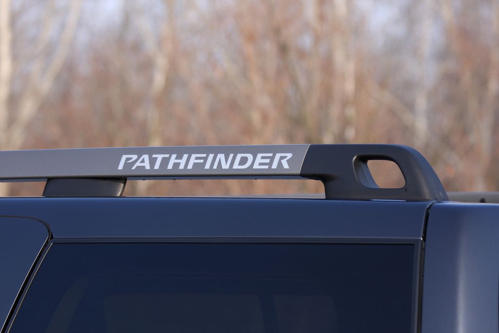 A 4,8 méter hosszú, tükrök nélkül 1,85 m széles, és tetősínnel, 18 colos könnyűfém felnivel ugyanilyen magas hasábforma méretei ellenére nem hivalkodó. A karosszéria cicomái szerények, szinte csak a kötelező elemek szerepelnek: krómozott hűtőmaszk, méhsejt-mintás beömlővel, beszállást könnyítő oldalsó fellépők, sötétített hátsó ablakok. A vonalzóval rajzolt forma valós méreteinél nagyobbnak hat, ezért tekintélyparancsolásból hibátlan a Pathfinder. Mintha korbácsot csattogtató falkavezérként állna szintén nem szerény méretű konkurensei fölött.