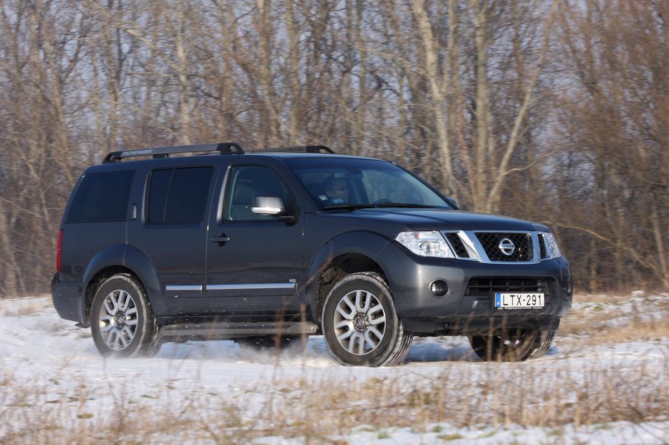 Érdekes elegy a 2,2 tonnás önsúly és a 231 lóerős, 550 Newtonméter nyomatékú V6-os dízelmotor. Sportautós teljesítmény egy kicsit sem gyorsulásbarát karosszériában. Hidegen ijesztő, tekintélyt parancsoló morajjal indul és néhány percig úgy is jár a 3,0 literes erőmű. Utána elcsendesedik, hangja távolivá válik, járása mindig egyenletes. A 7 fokozatú automata váltó csakis ennek, a kizárólag csúcsfelszereléssel kapható motornak a kiváltsága, más erőátvitellel nem is társítható a csúcsmotor. Higgadt gázkezeléssel komótosan váltogat az automata, már akár 2000/perc környékén felkapcsol, hiszen a motor 1200/perctől elviselhetően gyorsít. Padlógázra sem gyorsan gangol vissza és utána még a turbó feltöltődésére is várni kell picit, de végül nagyon komoly, már-már pusztító gyorsításra képes a V6-os. Igazából nagyon ritkán adódik olyan mértékű szabad tér, ahol bátran ki lehetne használni erejét. Ha mégis van, akkor álló helyzetből 100 km/órás tempóra 8,9 másodperc alatt gyorsulhat a Pathfinder és akár 200 km/órával is roboghat. Ez talán nem is olyan különleges, de az már komoly fegyvertény, hogy az útminőség nem igazán érdekli, hó, latyak, sár sem igazán gátolja. Hajtáslánca a platós Navaráéval egyező, de a vezérlés kicsit más. Alapesetben itt is a hátsó kerekek hajtanak, a menetstabilizáló elektronika jelei alapján azonban a számítógépes vezérlésű központi lamellás kuplungcsomag bármikor adhat nyomatékot az első kerekeknek is. Ezzel a rendszer teljesen bolond-biztos az alapesetben csupán hátsókerék hajtású Navarához mérten. A középkonzolon állandó összkerékhajtás és felezőfokozat is választható, a differenciálművek azonban nem zárhatóak. Az elpörgő kerekeket, önzáró differenciálművet játszva az ESP fékezi. Összességében – 21,6 cm-es hasmagasságával, 30 fokos első, 26 fokos hátsó terepszögével és 24 fokos rámpaszögével – a Pathfinder a legtöbb, autóval józan ésszel megközelíthető terepen elboldogul, sofőrjét lejtmenet és hegymenet vezérléssel is segíti. Mind a 48,7 fokos maximális oldaldőlési szög, mind pedig a 39 fokos kapaszkodóképesség olyan érték, amit csak a vérbeli terepezők mernek kihasználni.