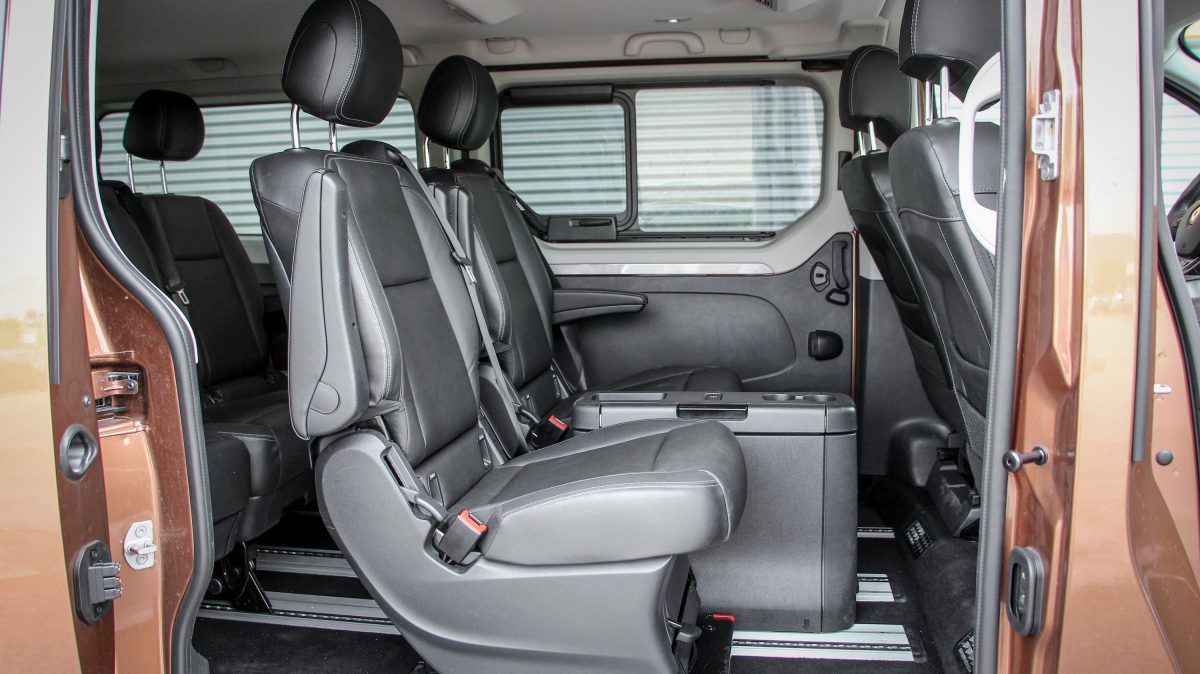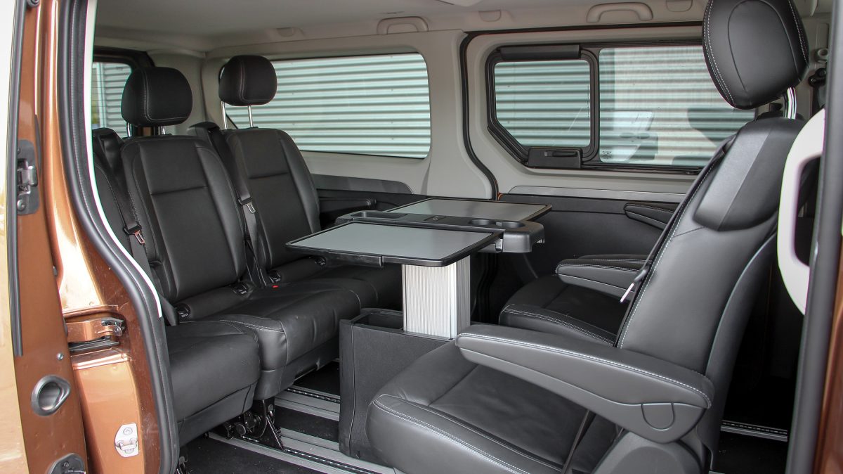A hátsó öt ülésből bal hátul kettőt egybeépítettek, de ezek is sínen mozgathatóak, ahogy a középső sor ülései is. A mozgatás csöppet macerás és nehézkes, ugyanis egy egészen apró kart kell felhúznunk, ami közvetlen a sín mellett van, így folyamatos a rettegés, hogy mikor csípi be az ujjunkat az egyébként nehezen mozgó ülés. Kézre állóbb helyen, följebb találjuk a forgatáshoz való kart, ugyanis nem kell kivenni az ülést ahhoz, hogy megfordítsuk, mint például egy Transit Customben. Van viszont egy másik akadály, a középső asztalka, ami szintén odébb csúsztatható és kell is ezzel élni az ülésforgatáshoz. Ezek a buszok sosem egyszerűek, minden kicsit nehézkesen mozog, de az asztalkát legalább teleszkóp emeli ki, összecsukásához sem kell túl nagy erőt kifejteni, így ez pozitív.