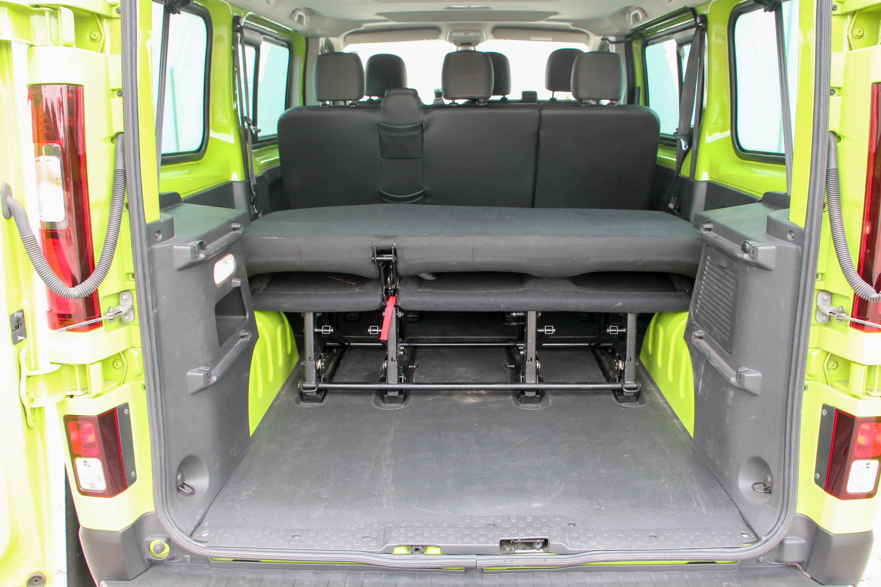 Ez a legkisebb. A nálunk járt L1H1, azaz kisebbik hosszúságú és alacsonytetős Trafic persze a legkisebb, nincs is 3,5, de még 3 tonna sem a megengedett össztömege. Az 1,9 tonnás saját tömeghez fejenként kevéssel több mint 100 kilogramm terhelhetőség jár, ami korrekt. Nyilván nem csempeszállításhoz, de ahhoz igen, hogy kilenc normál méretű utas még akár túrafelszereléssel, sícuccokkal is elutazhasson vele, bár utóbbi esetben azért már rezeghet a léc. És itt nem feltétlenül az ülések alatt végigdugható sílécekre gondoltam, de legalább rögtön sikerült megemlíteni az egyik legfőbb ütőkártyát, a remek pakolhatóságot. Alap, hogy a teljes hátfal kitárható, bázisként függőleges osztású, 180 fokban is nyitható ajtókkal, felárért nagyobb helyigénnyel, de pakolás közben esővédelmet is adó felfelé nyílóval. Nem nehézkes a bővítés, a harmadik üléssor támláját egyben dönthetjük le, majd az egész padot előre is buktathatjuk, meg persze a középsőhöz hasonlóan ki is vehetjük. A legizmosabbnak számító 145 lóerős dízelhez kizárólagos Pack Comfort felszereltséghez kalaptartót is kapunk.