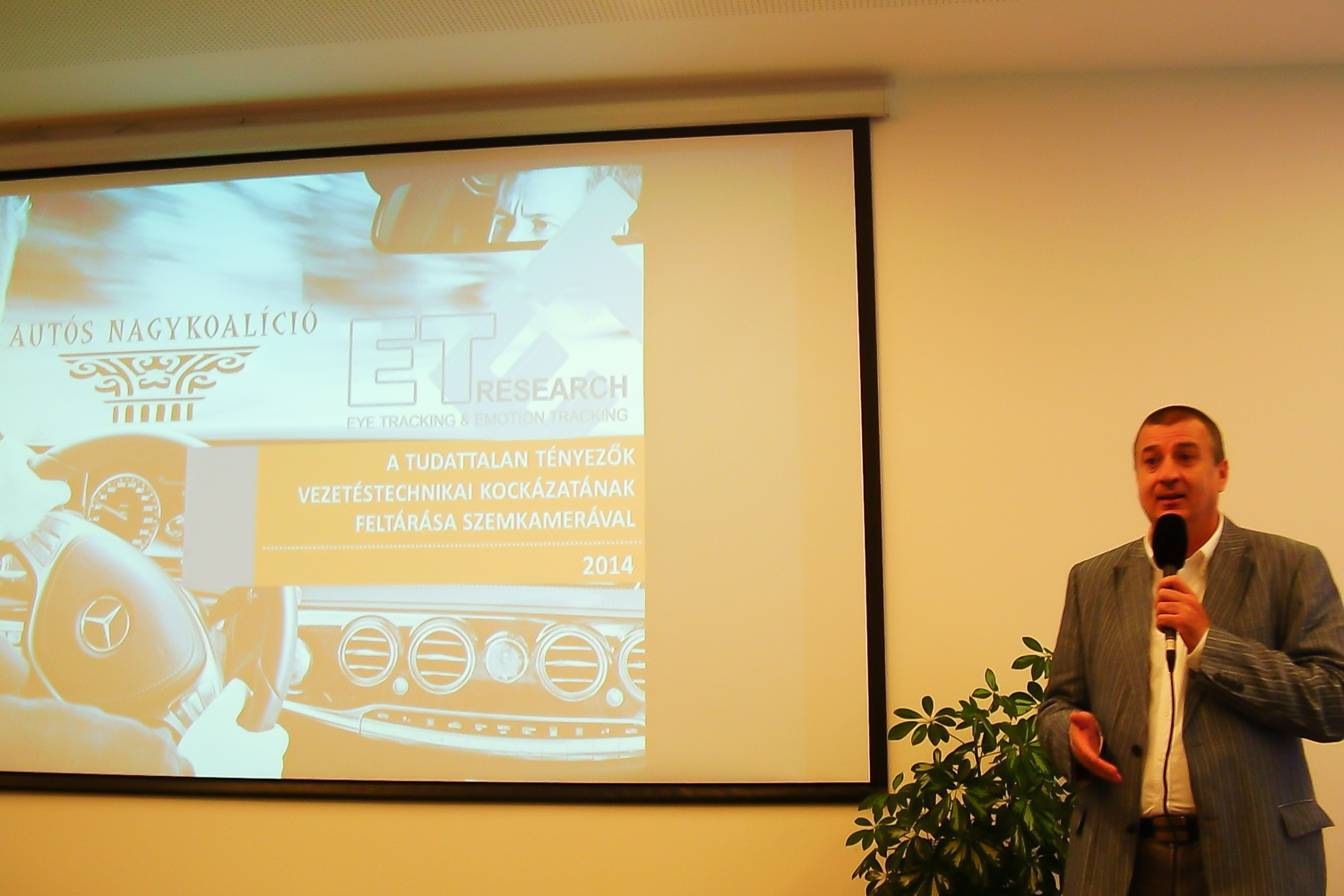 Knezsik István, az Autós Nagykoalíció elnöke a szemkamerás technológiában rejlő új, a vezetésbiztonság területén kamatoztatható, eddig tulajdonképpen kiaknázatlan lehetőségekre hívta fel a figyelmet. Hamar át is adta a szót Dr. Réti Istvánnak, az ET Research stratégiai igazgatójának. Dr. Réti elsősorban a marketing és piackutatás világában jártas, mint ahogy a szemkamerákat is először a vásárlók tudattalan szemmozgásának és a figyelem elterelődésén keresztüli tudattalan döntéseinek az elemzéséhez használták. Hogy ez mit jelent a gyakorlatban? Ha az utca embere számára figyelemfelkeltő például egy reklámtábla, akkor rápillant, ezzel ha nem is tudatosan, de közelebb kerül a termékhez, ergó a reklám jó volt, elérte a célját. Ez a folyamat szemkamerával vizsgálható. Úgy jön ide a közlekedésbiztonság kérdése, hogy vezetés közben is ezer dolog tereli el a figyelmünket. A közlekedési tábláknak jó, ha a tizedét látjuk, azaz fel is fogjuk, hogy mit jelentenek. Ez azért durván rossz arány. Még a legtapasztaltabb sofőrök is elvétenek jó pár "látnivalót" a szemkamerás vizsgálat tanúsága szerint.