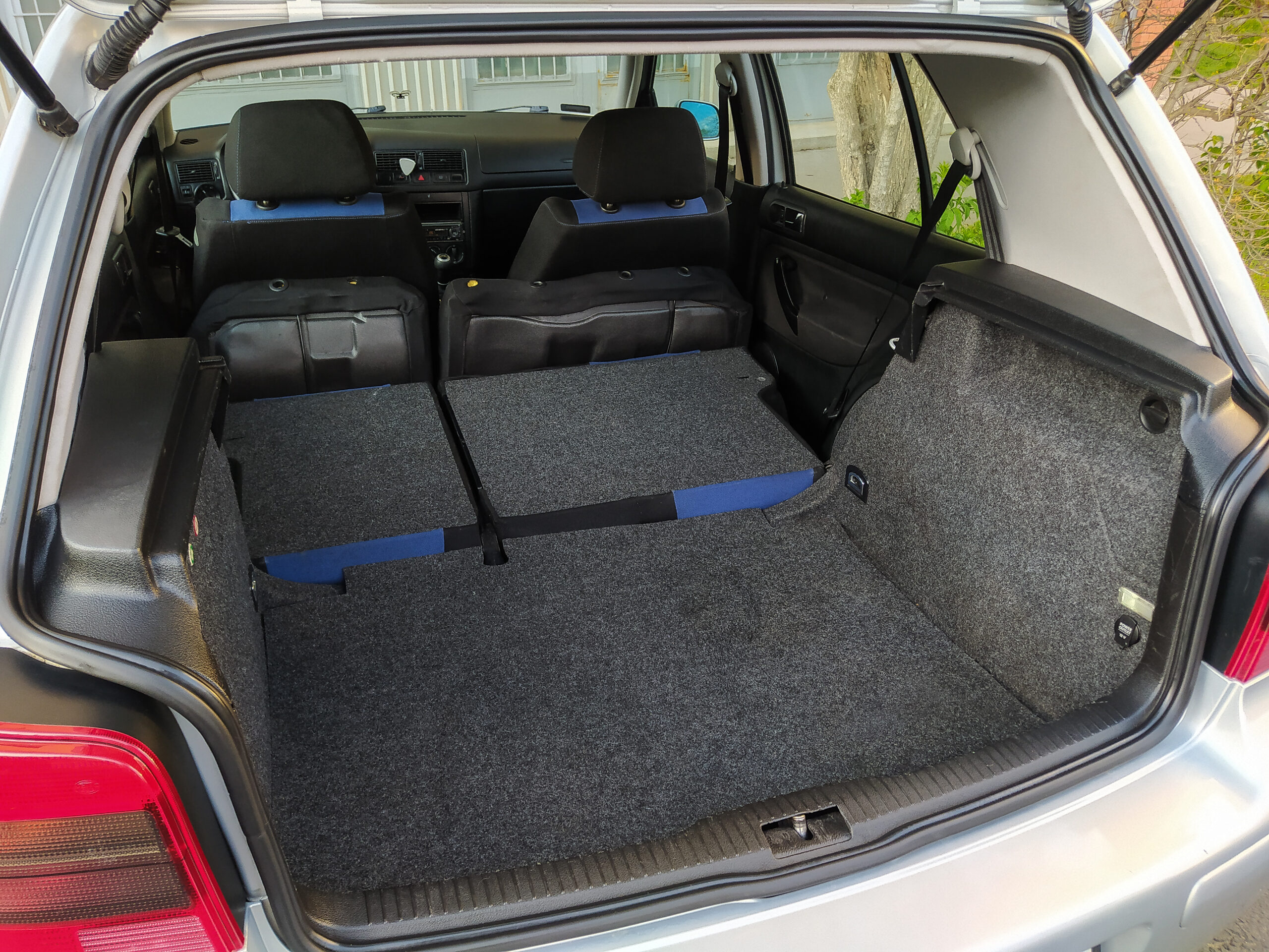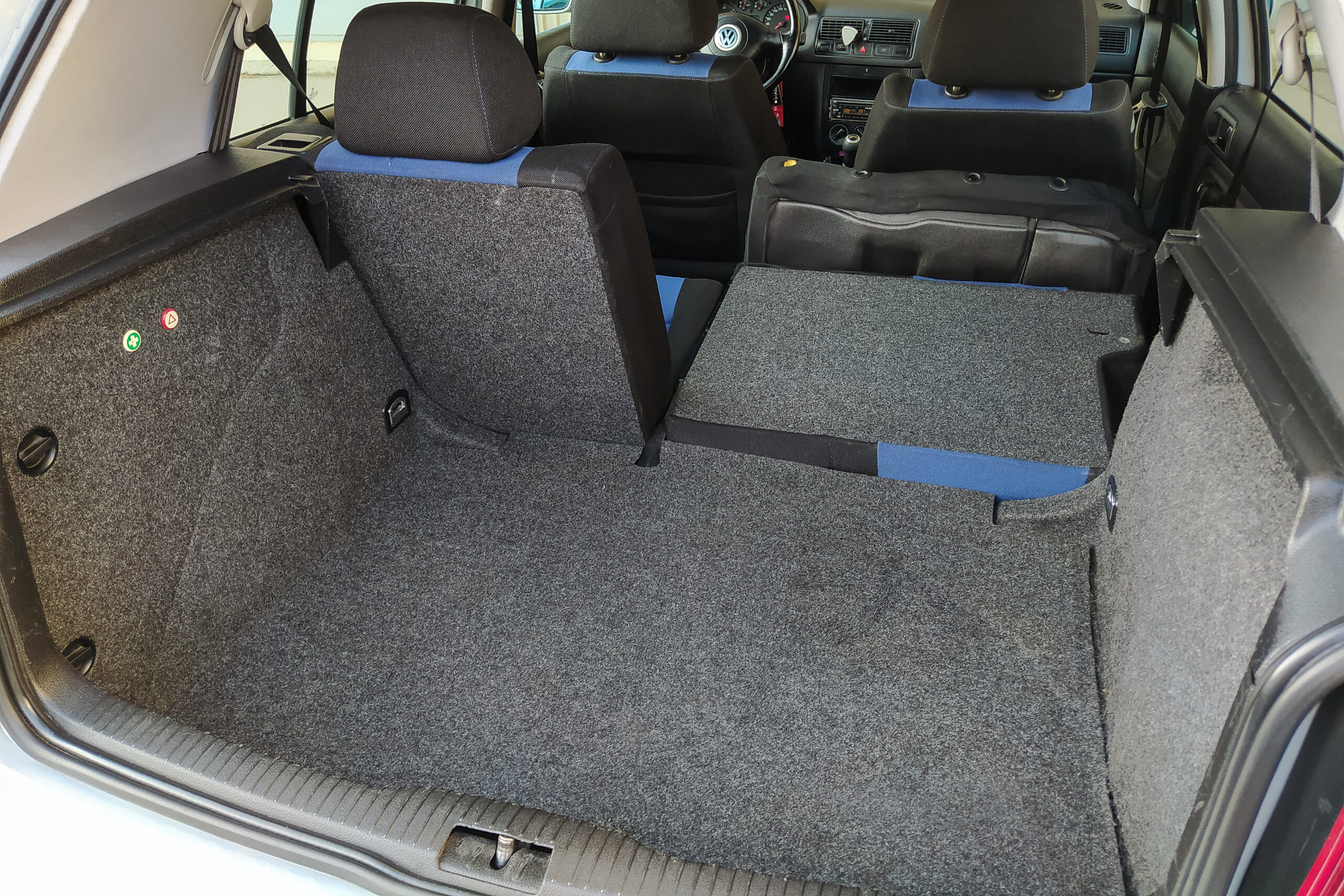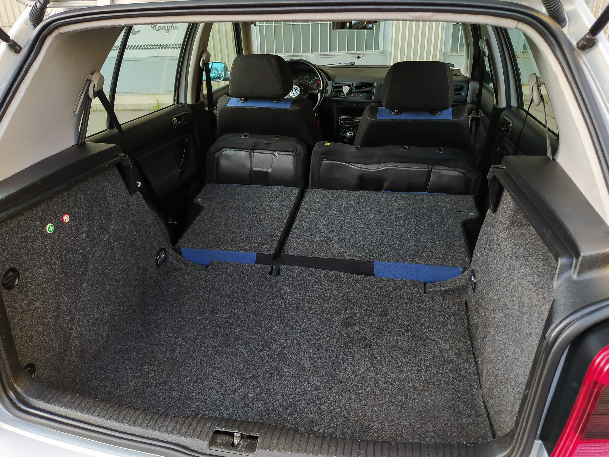 A helykínálat a kint látottakat igazolja, elférni benne hátul is, sem a fejtérrel, sem pedig a lábtérrel nincs probléma, ám közel sem olyan tágas, mint mondjuk az ötödik generációtól felfelé. Lényegében ugyanis a külső és a belső arányok tekintetében is e modell után nőtt igazán sokat a Golf, utódja már inkább a mai, nyolcadik generációhoz mérhető, mintsem a negyedikhez. Jól látszik ez a csomagtér formáján is, de szerencsére a méretein kevésbé érezhető: míg a Golf V 350 literrel, a Golf VIII pedig 380 literrel szolgálhat, addig a négyes esetében 330 literrel kell beérnünk. Szintén a régebbi formavilág maradványa, hogy az ülésdöntéshez itt még külön előre kell hajtani az ülőlapot is, ám szerencsére ez nem megy a 60:40 arányú dönthetőség vagy a sík padló rovására, úgy már közel 1200 literes rakteret kaphatunk.