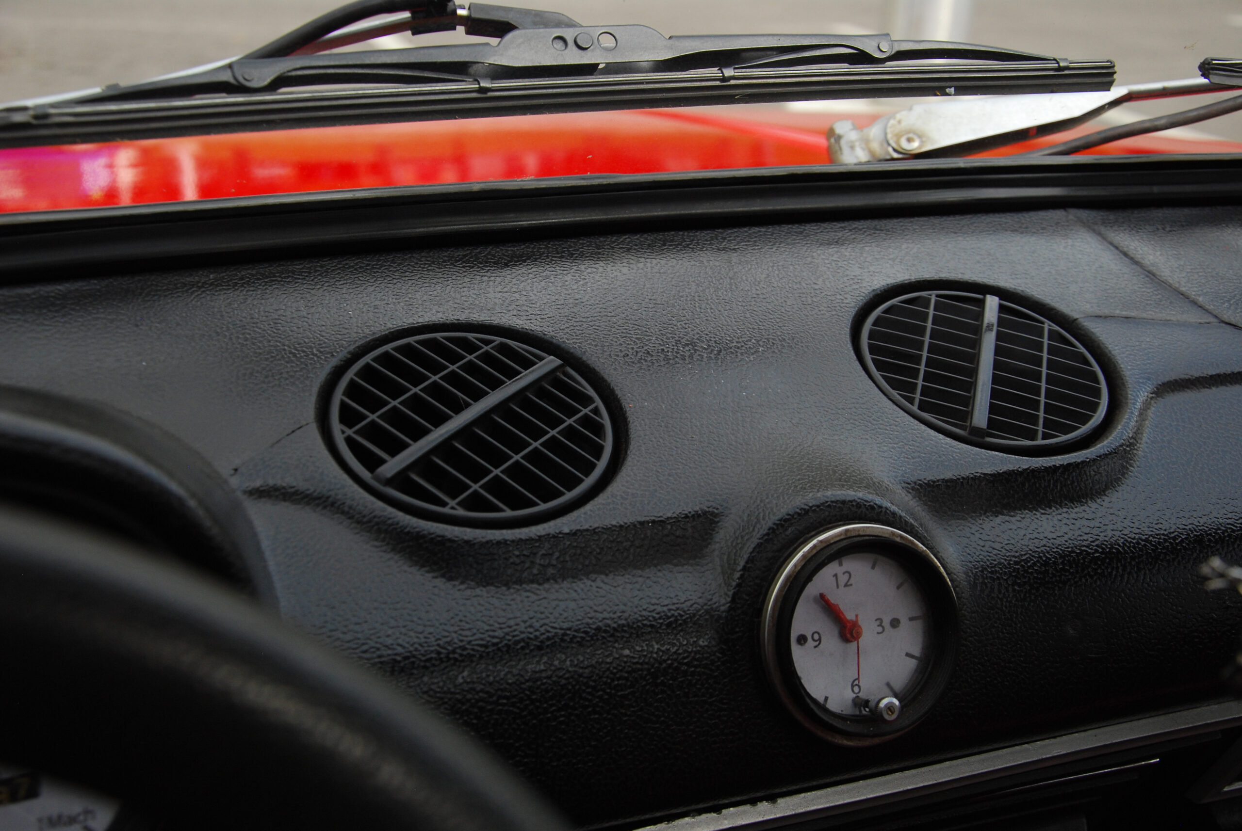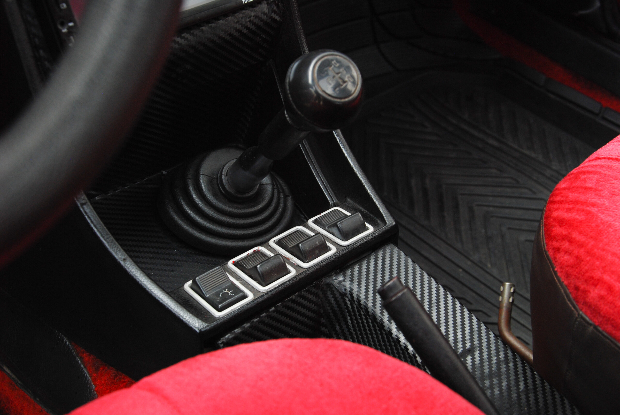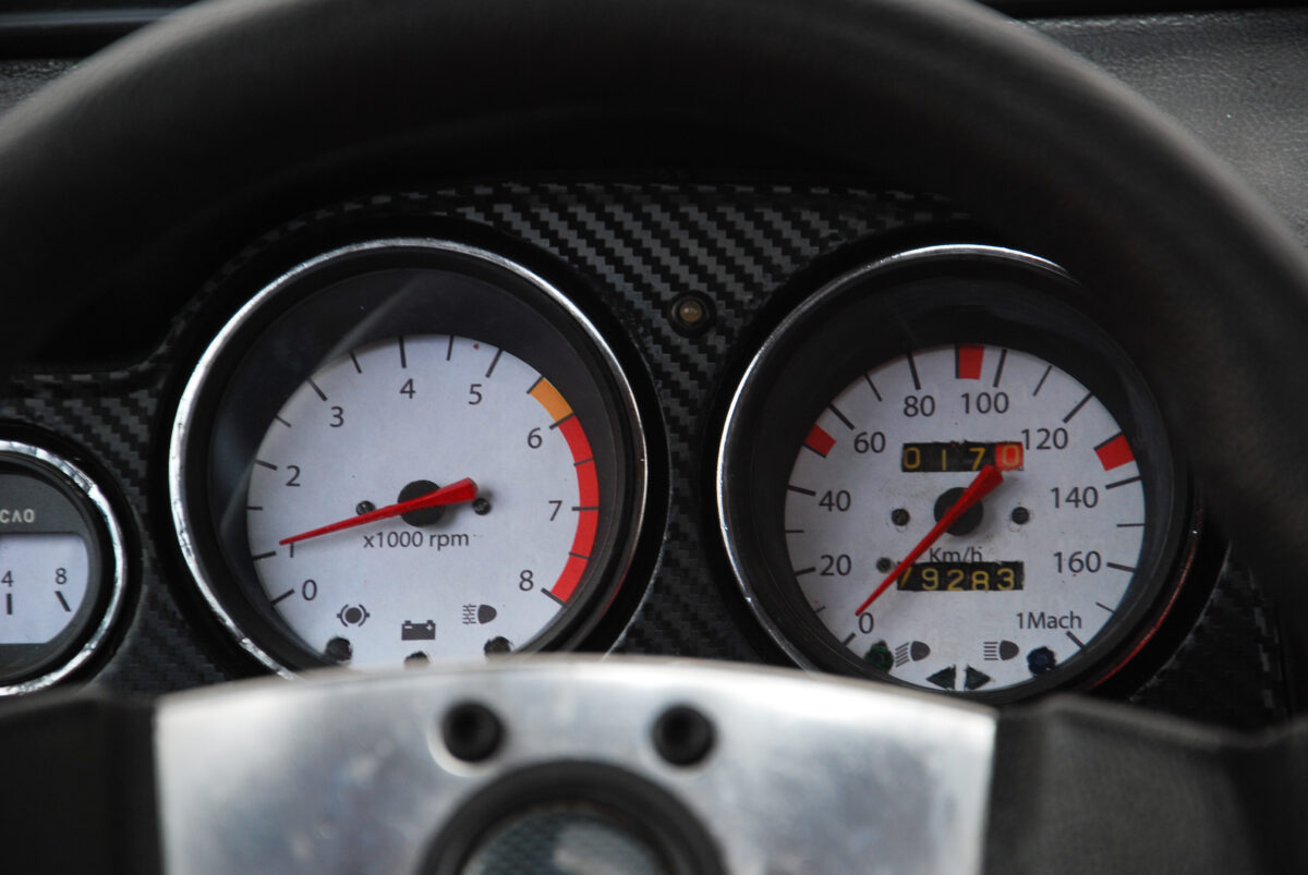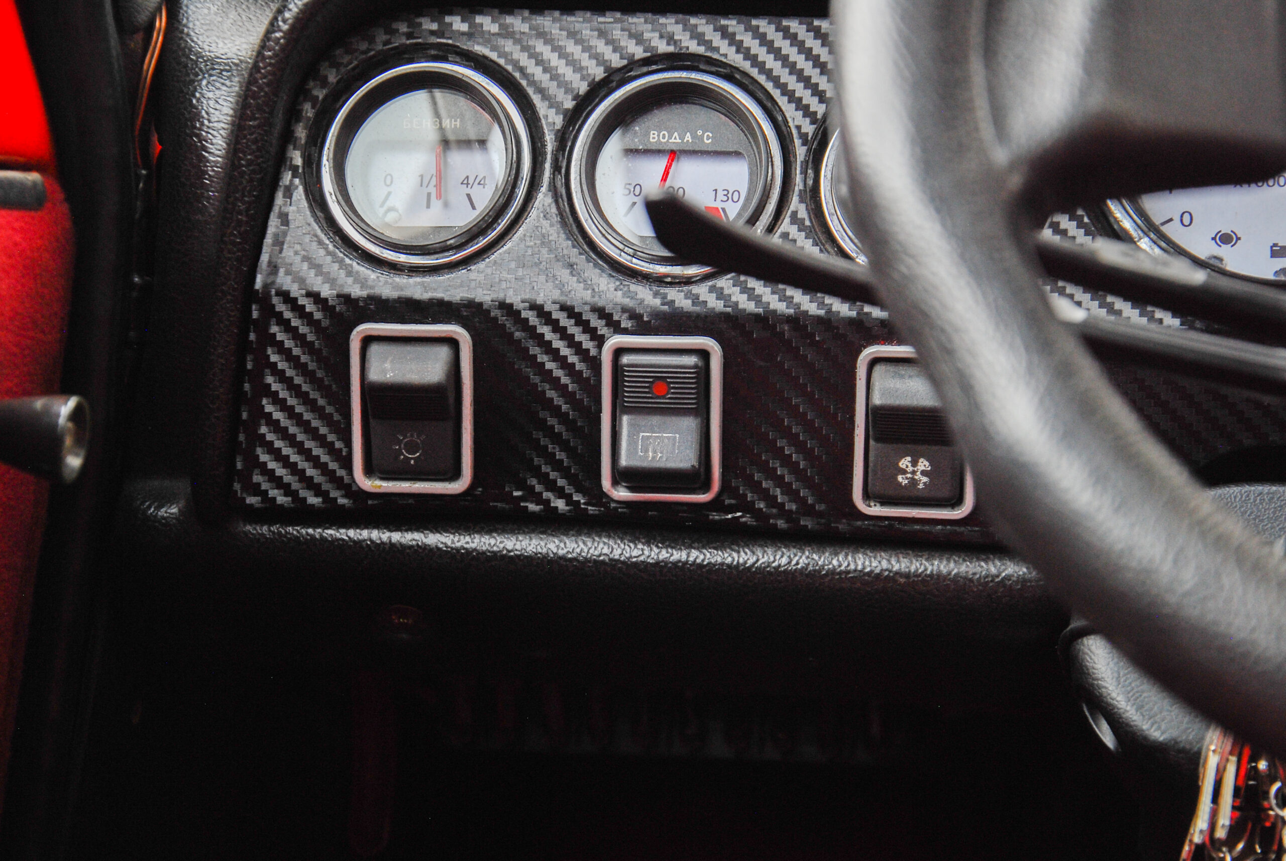 Jól áll neki az aprócska kormány és az órák fehér számlapjai, érdekes és viszonylag modern részlet az eredeti faberakás helyére került karbonmintás betét