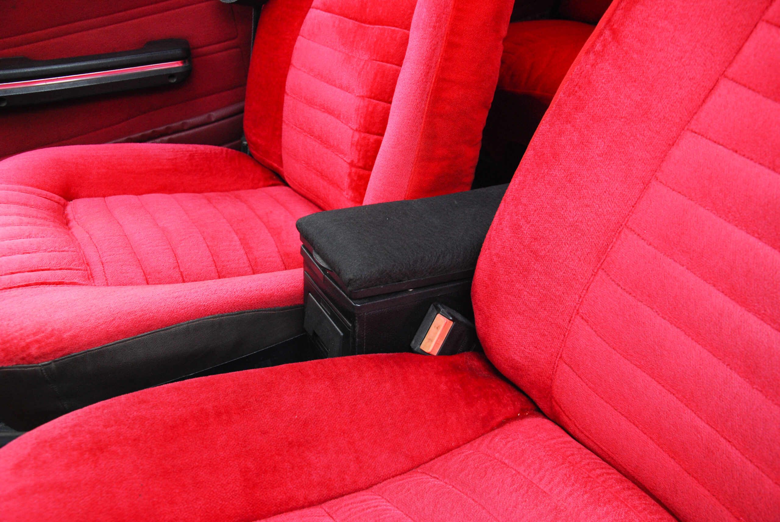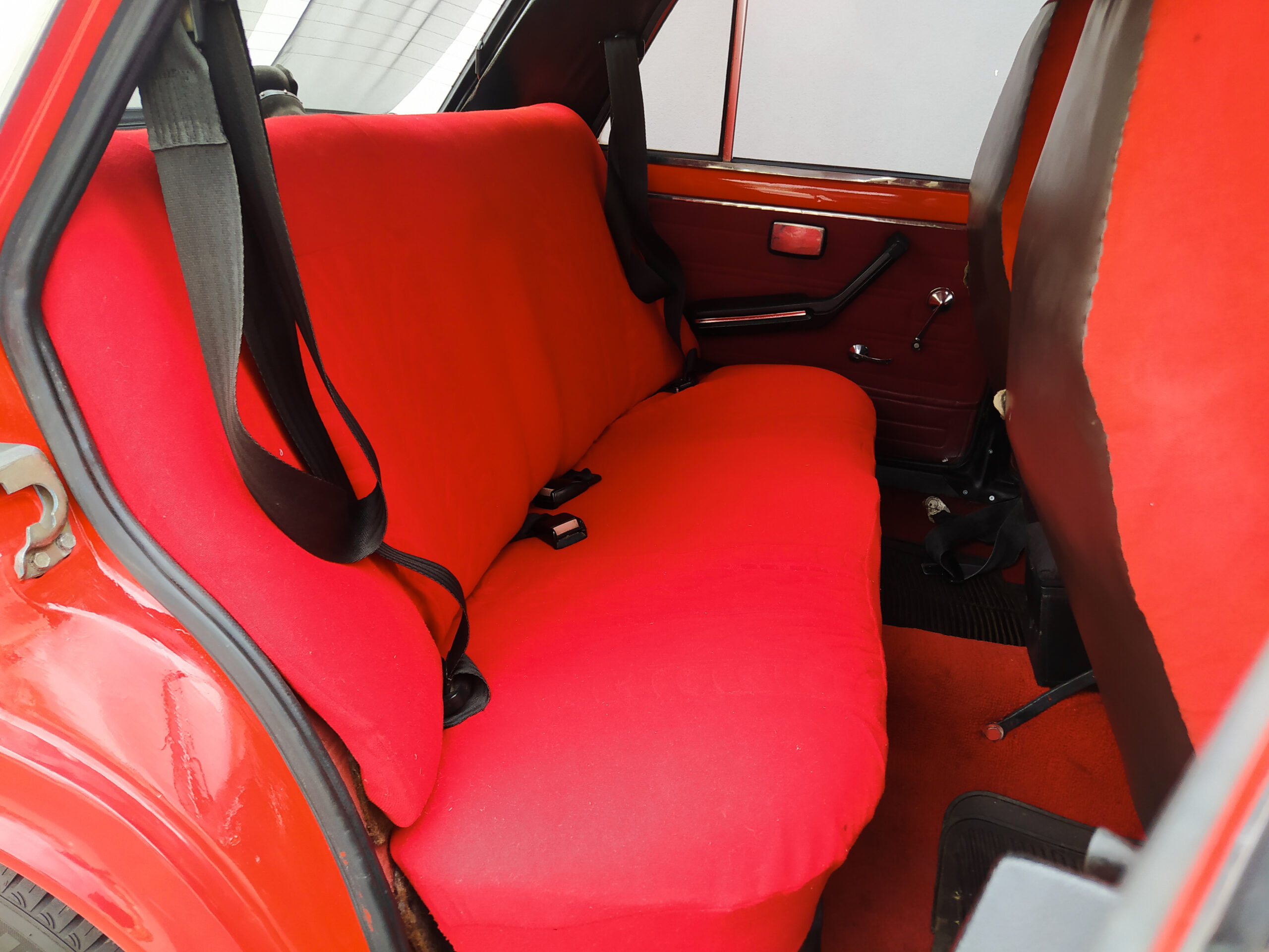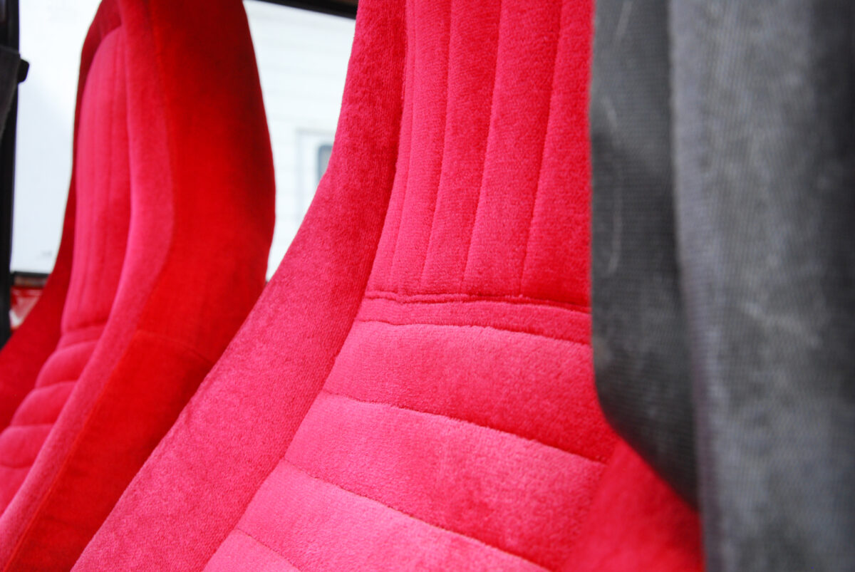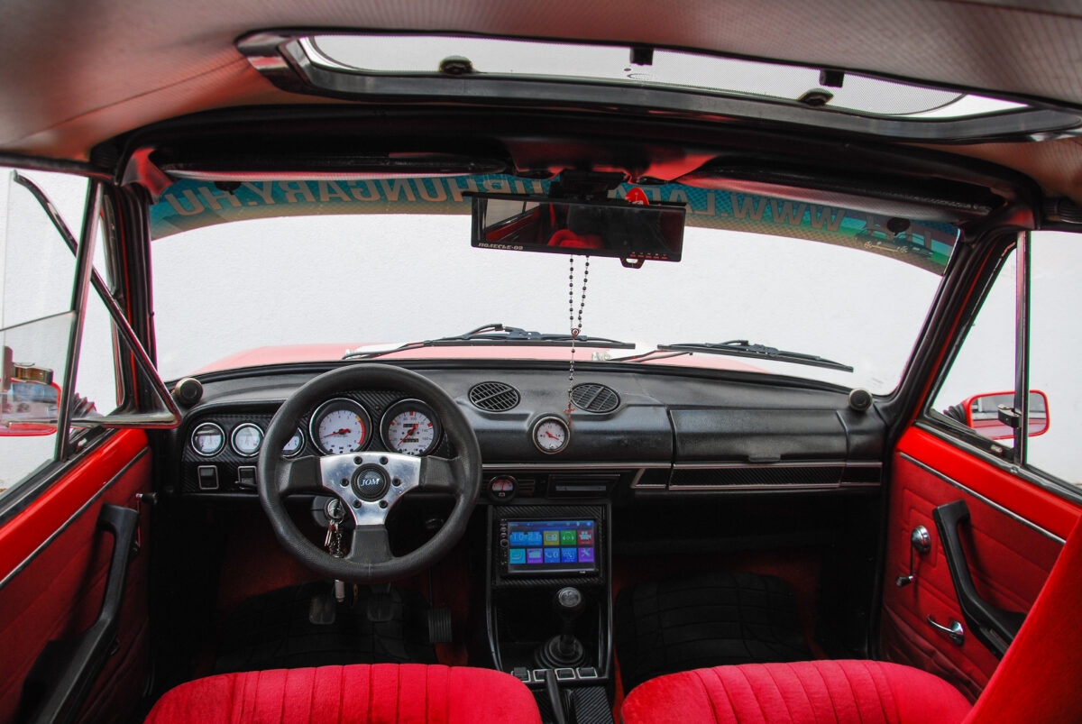 Bent talán még egyértelműbb, hogy az autóval ellentétben a tulajnak nincs ki mind a négy kereke, és ezt a lehető legjobb értelemben gondolom. Ügyesen vegyülnek a modern elemekkel a megszokott, korhű módosítások, mint például az ezeröcsi műszerfala, a sportkormány és a fehér órák. Ezeket azonban szinte észre sem veszi senki a vörös plüssbelső mellett, amely a Zsiguli eredeti, szoci-barna, fejtámla nélküli bőrüléseit helyettesíti. Ezek nem csak látványosak, de kényelmesek is, komoly előrelépést jelentenek az utazási komfort terén, természetesen automata biztonsági öv nem járt hozzájuk, az már túl sokat venne el a feelingből.