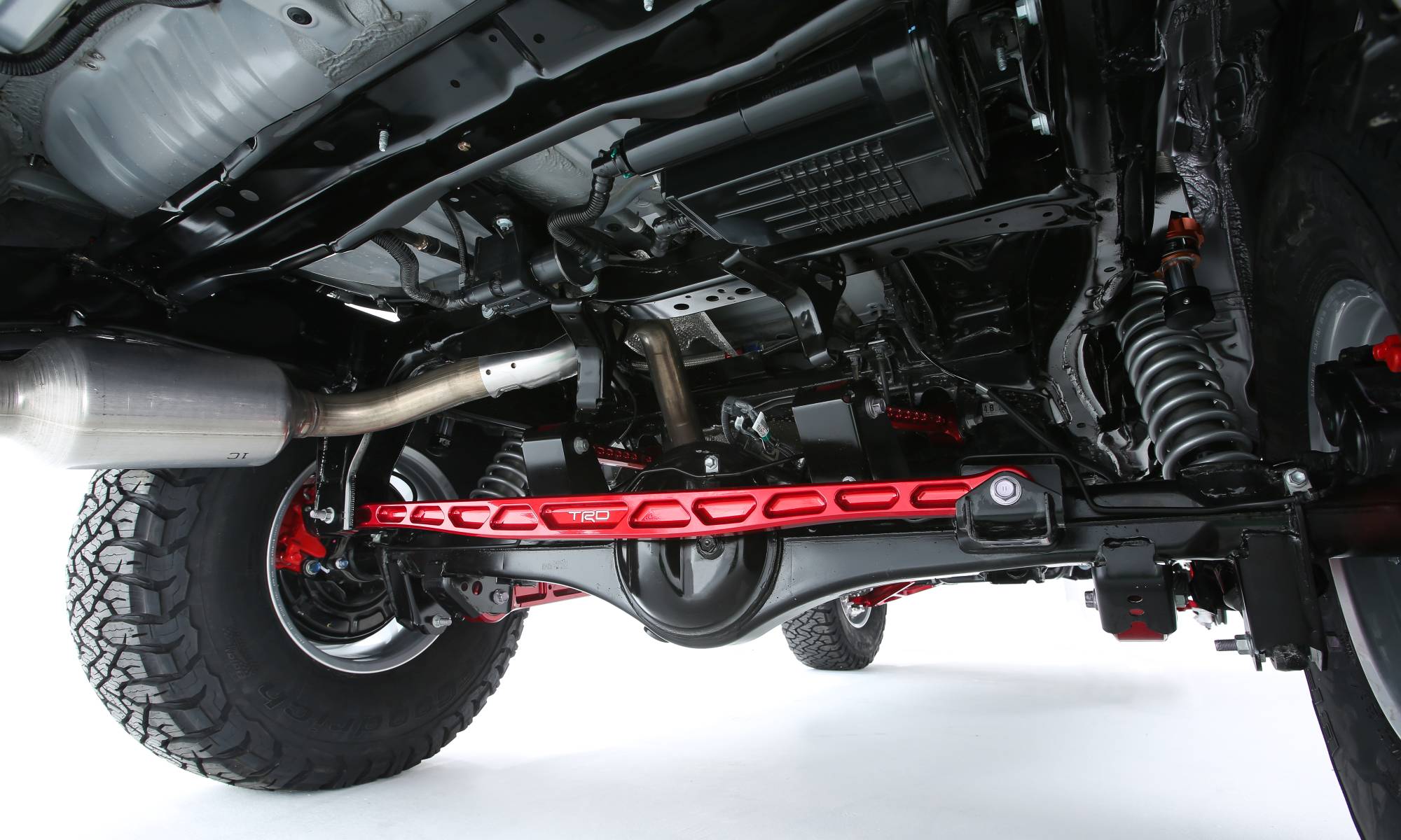 A külsőn tehát szinte minden megváltozott, a hajtáslánc azonban változatlan maradt. A 2,4 literes benzinmotoron persze nem volt indokolt változtatni, hiszen teljesítményadatai alapból jól mutatnak. A négyhengeres turbómotor a 4Runner TRD Surfben 278 lóerőt és 430 Nm nyomatékot ad le, ami minden helyzetre elég, akár arra is, hogy a mély tengerparti homokból kiássa magát az autó. Nem maradt meg gyári állapotában a futómű sem: a rugózatlan tömeg csökkentése érdekében mind a négy keréknél alumínium lengőkarok váltották fel az acélból készülteket. A nyolcfokozatú automatikus váltón és a felezőáttételen nem változtattak semmit, de a kipufogó a tuningnak köszönhetően kicsit ércesebben szól, mint a szériaváltozaton.