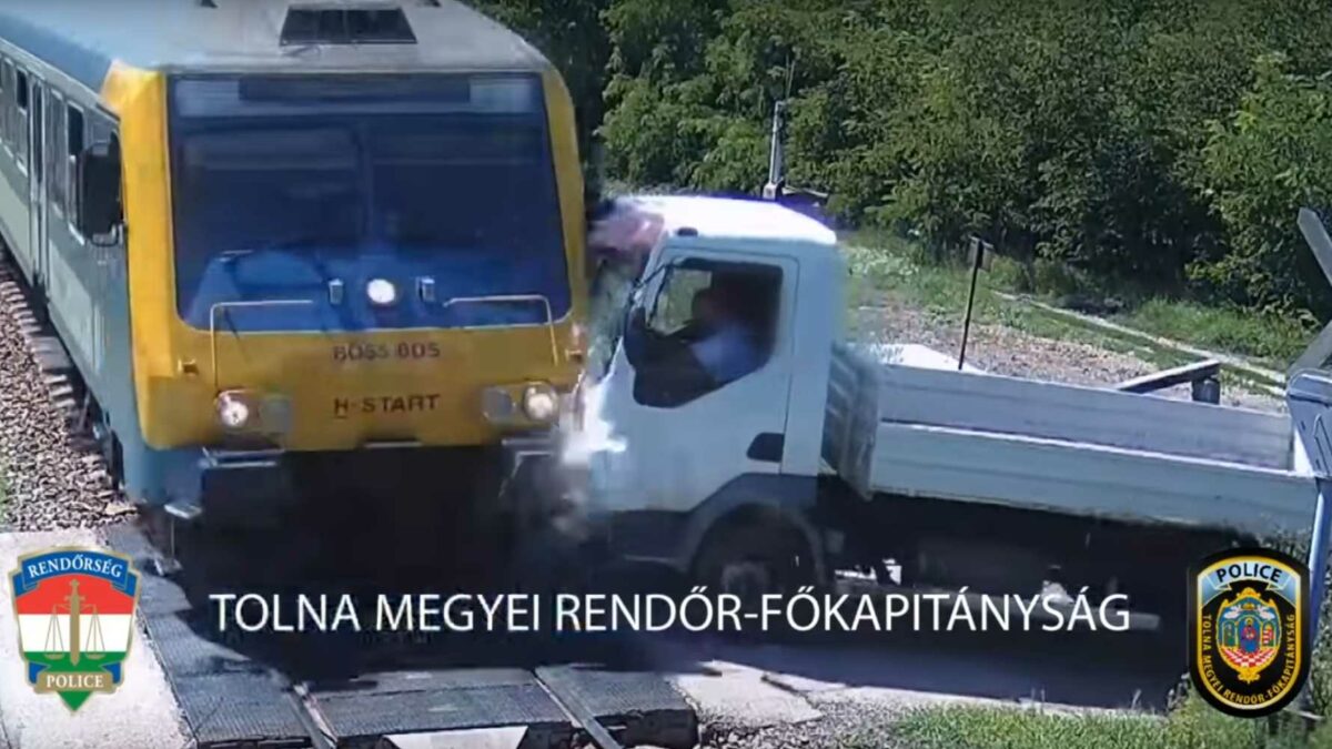 Simontornyán hajtott vonat elé ennek a teherautónak a sofőre, aki csak a szerencsének köszönheti az életét, miután a tilos jelzést figyelmen kívül hagyta.
