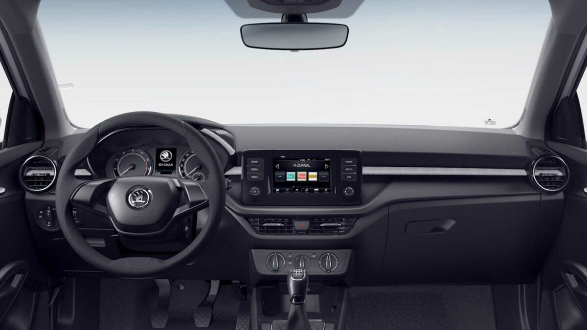 A sofőrt hagyományos sebesség- és fordulatszámmérő fogadja, a kettő közé egy kisebb kijelzőt építettek. A középkonzolon a minimális összegért cserébe is érintőképernyő trónol, aminek a 6,5 colos mérete felár ellenében nagyítható. Az alapár nem tartalmaz LED hangulatvilágítást, szövetbetétes műszerfalat és gombok sem lesznek a kormányon, de légkondi mindenképpen jár a Fabiához, ebben az esetben manuális kivitelben. A tükrök minden esetben elektromosan állíthatóak és fűtöttek, az első ablakokat villanymotor mozgatja. Légzsákból négyet kap a legolcsóbb modell, az első utasokat front- és oldallégzsákok védik.