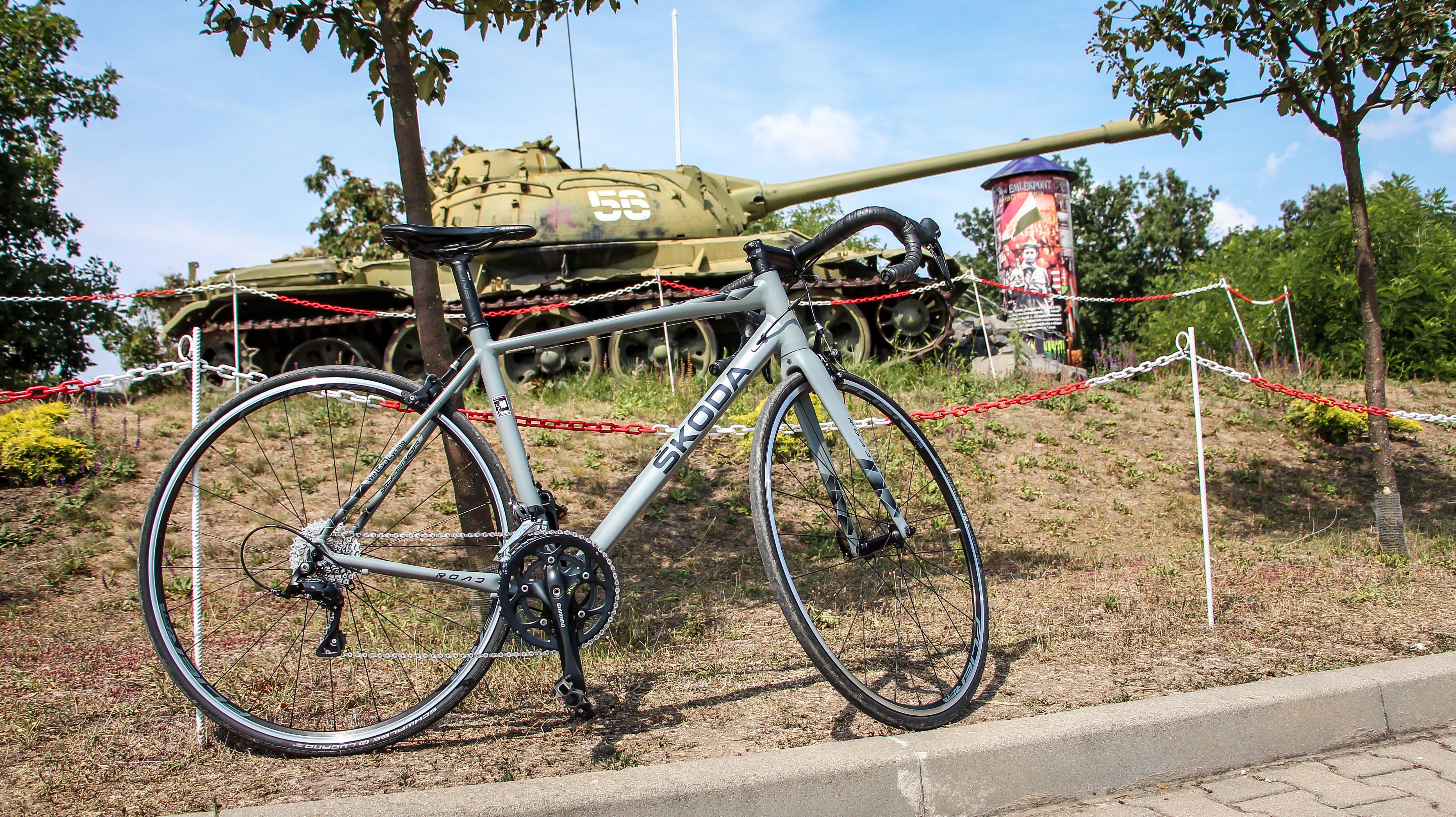 A Karoqról majd később bővebben is szót ejtünk, most csak a kerékpárokról lesz szó, melyek közül kezdjük talán a leghagyományosabbal. A Skoda 2004 óta a Tour de France kerékpárverseny egyik legnagyobb hivatalos támogatója, így ha már árulnak kerékpárt, az országúti semmiképp sem maradhat ki. A Road talán a legszebb a három közül, ám tény, hogy igazán komolyan kell űzni ezt a sportot, ha valaki ezt választja. A klasszikus, teljesen előre dőlt pozíció nem épp a hétvégi bringásoknak kedvez, nekem ez volt az első ilyen élményem. Lenyűgöző, hogy csupán 9,6 kilót nyom, ami a könnyű alumíniumból készült váznak és a kis légellenállásúra tervezett, ultrakönnyű szénszálas műanyagból készült első villának köszönhető. Az ujjnyi vékony gumik szinte ellenállás nélkül gurulnak, a kormány több pozícióban fogható, és rendkívül puha gumiszalaggal bandázsolták, a függőlegesen álló fékkarok pedig egyben a váltók karjai is. A fék itt bowdenes, annak és a váltóknak a vezetékeit pedig a vázban vezették el, nem lóg ki semmi.