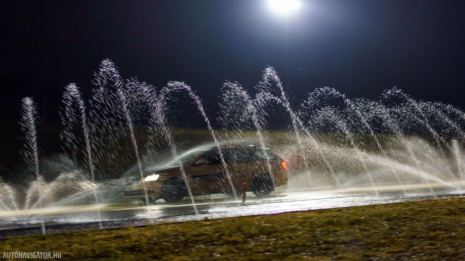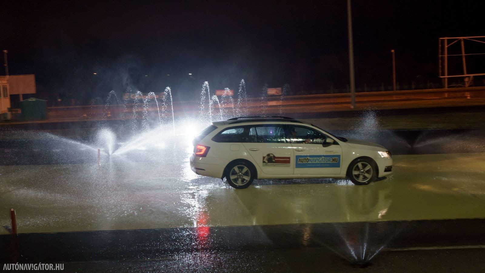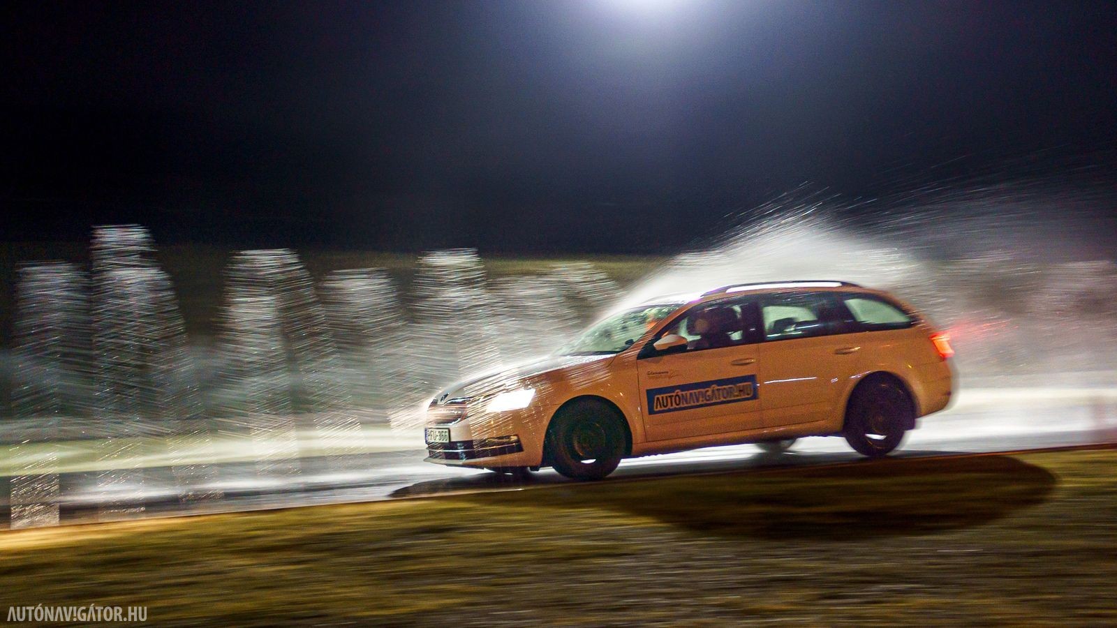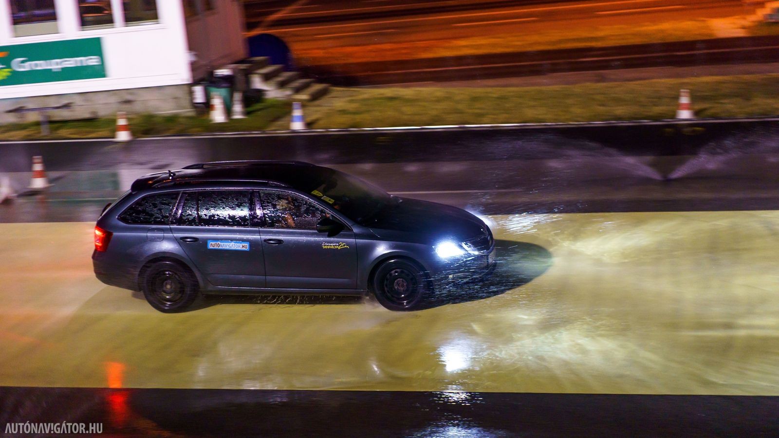 Nem csak fékeztünk, kapaszkodtunk is a nedves műgyantán, a nyári gumi itt is elvérzett, a négyévszakosak gyengén szerepeltek