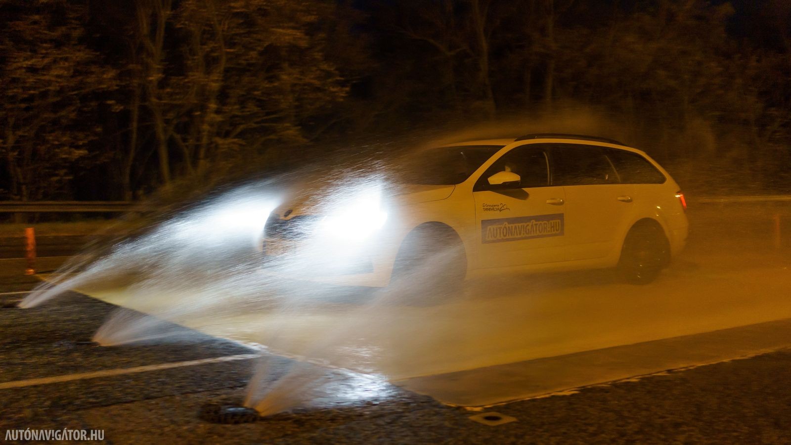 Az elmúlt években is tapasztaltuk, most is, az útfelület nedvessége csupán az egyik változó a tapadás kapcsán. Nyilván perdöntő a gumiabroncs fajtája, de az aktuális hőmérséklet is. Olyannyira, hogy már 1-2 Celsius foknyi különbség is érezhető lehet a tapadás kapcsán. Különösen igaz ez fagypont alatt, pláne hóban, de bizony normál aszfalton és fagypont felett is. Tesztünket 4 Celsius fokos levegőhőmérséklet, 2-2,5 fokos aszfalt mellett kezdtük, az idő először hűlni, majd a felhősödés miatt melegedni kezdett, az pedig állandó volt, hogy a föld alatti tartályból locsolt aszfalt melegebb lett a rá eső víztől, mint a száraz. Ezért most is az a szokatlan helyzet állt elő, hogy a melegebb, de vizes aszfalt rövidebb fékutat adott, mint a száraz, de hűvösebb. Furcsa, de hasznos tapasztalat:nem csak a csapadéktól, a hőmérséklet változásától is nőhet a fékút, csökkenhet a tapadás, ezzel bizony érdemes számolni! Ahogyan persze azzal is, hogy mit tud a saját gumiabroncsunk.